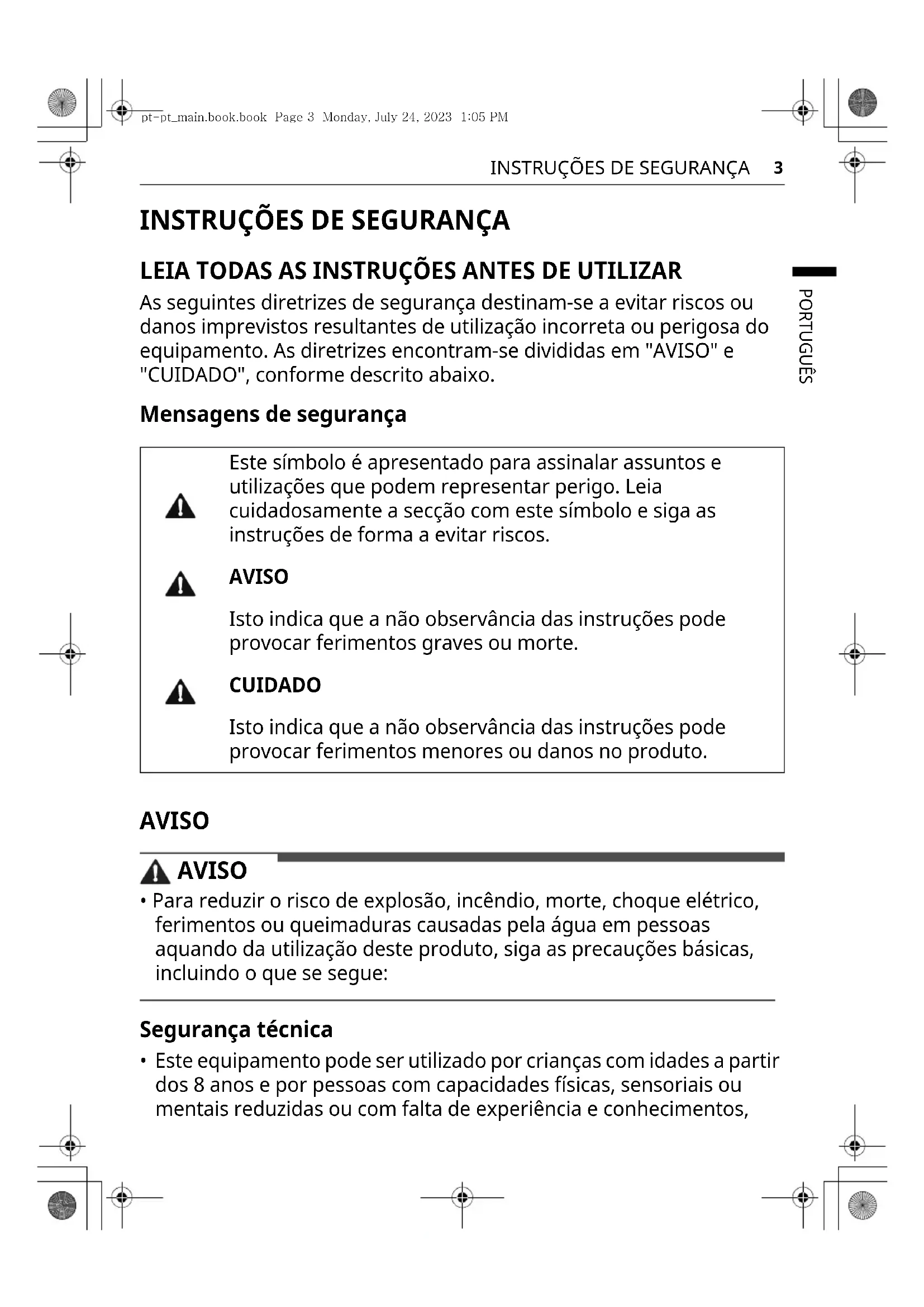 - Este equipamento pode ser utilizado por crianças com idades a partir dos 8 anos e por pessoas com capacidades físicas, sensoriais ou mentais reduzidas ou com falta de experiência e conhecimentos, Este símbolo é apresentado para assinalar assuntos e utilizações que podem representar perigo. Leia cuidadosamente a secção com este símbolo e siga as instruções de forma a evitar riscos. AVISO Isto indica que a não observância das instruções pode provocar ferimentos graves ou morte. CUIDADO Isto indica que a não observância das instruções pode provocar ferimentos menores ou danos no produto. pt-pt_main.book.book Page 3 Monday, July 24, 2023 1:05 PM4