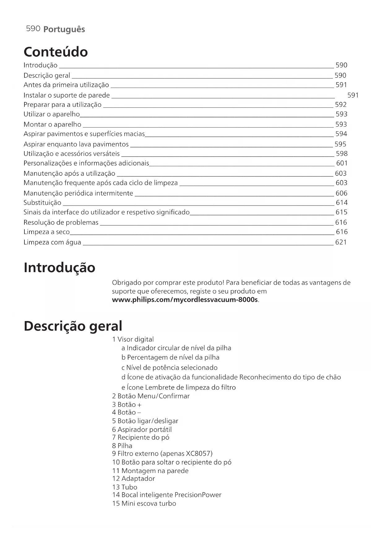 Português Conteúdo Introdução ________________________________________________________________________________ 590 Descrição geral ____________________________________________________________________________ 590 Antes da primeira utilização _________________________________________________________________ 591 Instalar o suporte de parede _________________________________________________________________ 591 Preparar para a utilização ___________________________________________________________________ 592 Utilizar o aparelho__________________________________________________________________________ 593 Montar o aparelho _________________________________________________________________________ 593 Aspirar pavimentos e superfícies macias_______________________________________________________ 594 Aspirar enquanto lava pavimentos ___________________________________________________________ 595 Utilização e acessórios versáteis ______________________________________________________________ 598 Personalizações e informações adicionais______________________________________________________ 601 Manutenção após a utilização _______________________________________________________________ 603 Manutenção frequente após cada ciclo de limpeza _____________________________________________ 603 Manutenção periódica intermitente __________________________________________________________ 606 Substituição _______________________________________________________________________________ 614 Sinais da interface do utilizador e respetivo significado__________________________________________ 615 Resolução de problemas ____________________________________________________________________ 616 Limpeza a seco_____________________________________________________________________________ 616 Limpeza com água _________________________________________________________________________ 621 Introdução Obrigado por comprar este produto! Para beneficiar de todas as vantagens de suporte que oferecemos, registe o seu produto em www.philips.com/mycordlessvacuum-8000s. Descrição geral 1 Visor digital a Indicador circular de nível da pilha b Percentagem de nível da pilha c Nível de potência selecionado d Ícone de ativação da funcionalidade Reconhecimento do tipo de chão e Ícone Lembrete de limpeza do filtro 2 Botão Menu/Confirmar 3 Botão + 4 Botão – 5 Botão ligar/desligar 6 Aspirador portátil 7 Recipiente do pó 8 Pilha 9 Filtro externo (apenas XC8057) 10 Botão para soltar o recipiente do pó 11 Montagem na parede 12 Adaptador 13 Tubo 14 Bocal inteligente PrecisionPower 15 Mini escova turbo591 Português 16 Acessório de dupla função 17 Escova macia 18 Acessório para estofos 19 Acessório para fendas 20 Bocal do aspirador e esfregona 21 Depósito Aqua 22 Base da esfregona em microfibra Antes da primeira utilização Instalar o suporte de parede 1 Inverta o suporte de parede e solte o manípulo cinzento. Introduza a porta de carregamento, certificando-se de que a parte de metal fica visível e na posição vertical, no lado frontal do suporte de parede. 2 Disponha o cabo de forma harmoniosa, encaixando-o na ranhura para o efeito. 3 Feche o manípulo cinzento. Certifique-se de que o manípulo cinzento fica bloqueado após ouvir o som de encaixe. 110 ± 2 cm 4 Fixe firmemente o suporte de parede na posição desejada, certificando-se de que os orifícios de aparafusamento do suporte ficam a cerca de 110 cm do chão. Atenção: Tenha cuidado quando perfurar a parede para pendurar o suporte de parede, a fim de evitar o risco de choques elétricos.592 Português Nota: Verifique se o posicionamento do suporte de parece permite que todo o aparelho fique pendurado sem o bocal entrar em contacto com o chão. 5 Assim que tiver determinado qual a posição e altura ideais de armazenamento e carregamento do seu aparelho, aperte firmemente os parafusos de forma a fixar bem o suporte de parede. Preparar para a utilização Este aparelho vem equipado com uma bateria de iões de lítio. Carregar a bateria por completo demora cerca de 6 horas. 1 Acople o corpo da bateria ao corpo principal do aparelho, certificando-se de que a união de ambos é segura após ouvir o som de encaixe. MAX 40⁰C MIN 5⁰C 2 Carregue o seu aparelho colocando-o no suporte de parede instalado. Advertência: Guarde e carregue o aparelho a uma temperatura superior a 5 °C e inferior a 40 °C.593 Português Nota: Também pode colocar o aparelho portátil numa superfície nivelada e estável, e ligar diretamente o aparelho ao cabo de carregamento.
