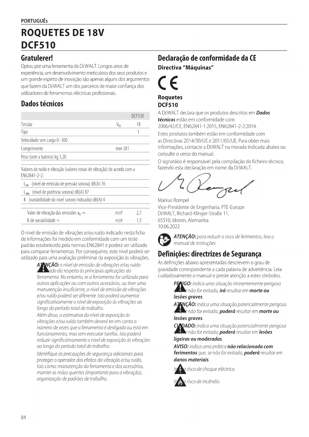 tettsitting ved å slippe avtrekkeren og bruke dreiemomentet forhånd. MERk: Kraftig manuelt påført moment kan skade ambolten dersom momentgrensen på 101Nmoverskrides.84 PORTUGUês ATENÇÃO: para reduzir o risco de ferimentos, leia o manual deinstruções. Definições: directrizes de Segurança As definições abaixo apresentadas descrevem o grau de gravidade correspondente a cada palavra de advertência. Leia cuidadosamente o manual e preste atenção a estessímbolos. PERIGO: indica uma situação iminentemente perigosa que, se não for evitada, irá resultar em morte ou lesõesgraves. ATENÇÃO: indica uma situação potencialmente perigosa que, se não for evitada, poderá resultar em morte ou lesõesgraves. CUIDADO: indica uma situação potencialmente perigosa que, se não for evitada, poderá resultar em lesões ligeiras oumoderadas. AVISO: indica uma prática não relacionada com ferimentos que, se não for evitada, poderá resultar em danosmateriais. Indica risco de choqueeléctrico. Indica risco deincêndio. Declaração de conformidade da CE Directiva “Máquinas” Roquetes DCF510 A DeWALT declara que os produtos descritos em Dados técnicos estão em conformidade com: 2006/42/CE, EN62841‑1:2015, EN62841‑2‑2:2014.Estes produtos também estão em conformidade com as Directivas 2014/30/UE e 2011/65/UE. Para obter mais informações, contacte a DeWALT na morada indicada abaixo ou consulte o verso domanual.O signatário é responsável pela compilação do ficheiro técnico, fazendo esta declaração em nome daDeWALT.Markus Rompel Vice‑Presidente de Engenharia, PTE‑Europe DeWALT, Richard‑Klinger‑Straße 11, 65510, Idstein, Alemanha 10.06.2022O nível de emissão de vibrações e/ou ruído indicado nesta ficha de informações foi medido em conformidade com um teste padrão estabelecido pela normas