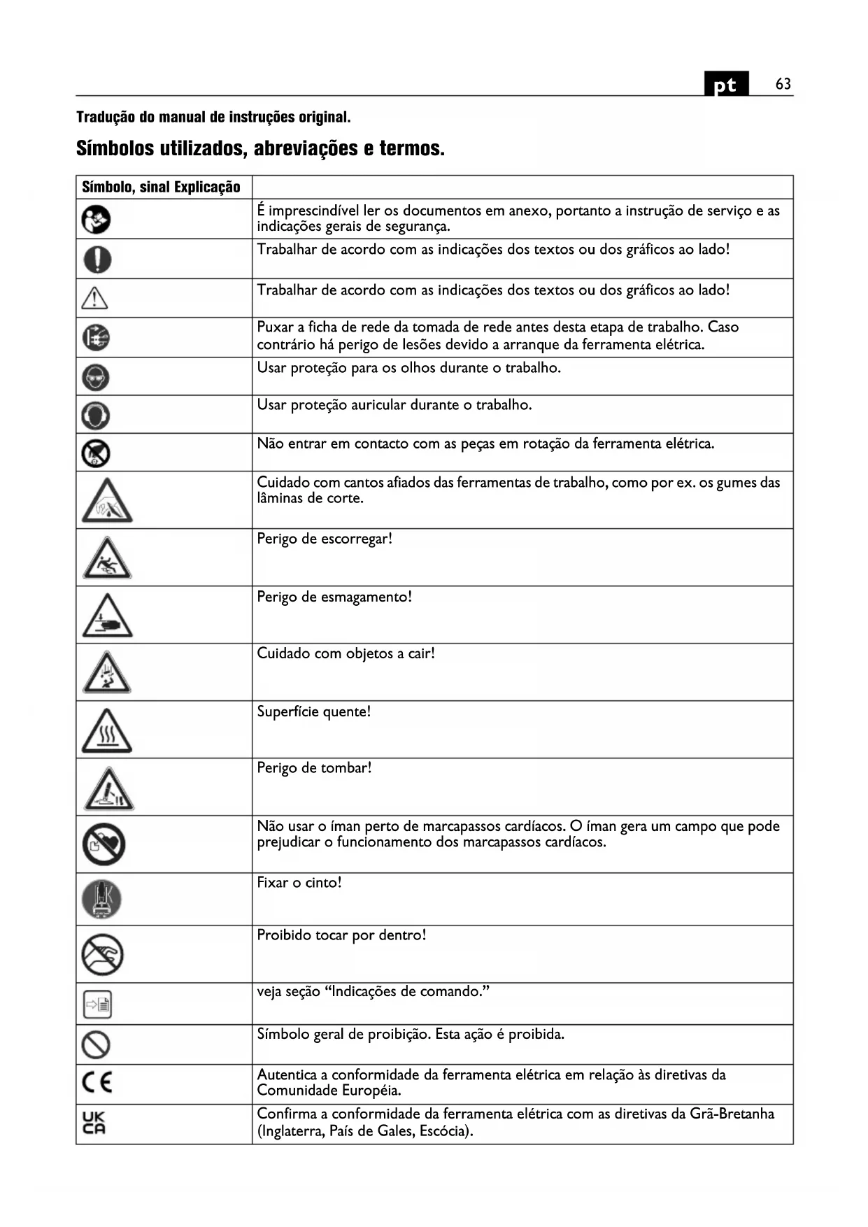 Tradução do manual de instruções original. Símbolos utilizados, abreviações e termos. Símbolo, sinal Explicação É imprescindível ler os documentos em anexo, portanto a instrução de serviço e as indicações gerais de segurança. Trabalhar de acordo com as indicações dos textos ou dos gráficos ao lado! Trabalhar de acordo com as indicações dos textos ou dos gráficos ao lado! Puxar a ficha de rede da tomada de rede antes desta etapa de trabalho. Caso contrário há perigo de lesões devido a arranque da ferramenta elétrica. Usar proteção para os olhos durante o trabalho. Usar proteção auricular durante o trabalho. Não entrar em contacto com as peças em rotação da ferramenta elétrica. Cuidado com cantos afiados das ferramentas de trabalho, como por ex. os gumes das lâminas de corte. Perigo de escorregar! Perigo de esmagamento! Cuidado com objetos a cair! Superfície quente! Perigo de tombar! Não usar o íman perto de marcapassos cardíacos. O íman gera um campo que pode prejudicar o funcionamento dos marcapassos cardíacos. Fixar o cinto! Proibido tocar por dentro! veja seção “Indicações de comando.” Símbolo geral de proibição. Esta ação é proibida. Autentica a conformidade da ferramenta elétrica em relação às diretivas da Comunidade Européia. Confirma a conformidade da ferramenta elétrica com as diretivas da Grã-Bretanha (Inglaterra, País de Gales, Escócia).64