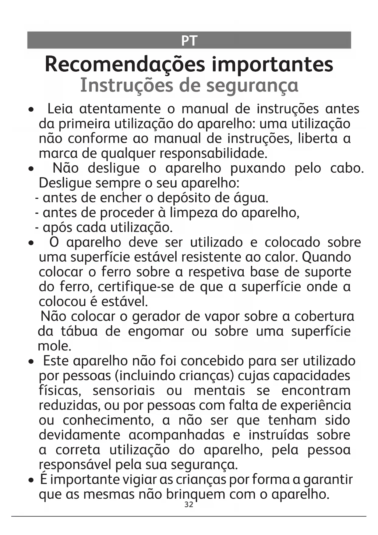 - Este aparelho pode ser utilizado por crianças a partir dos 8 anos de idade e por pessoas sem experiência e conhecimentos ou com capacidades físicas, sensoriais ou mentais reduzidas, se tiverem recebido formação e supervisão relativamente à utilização do aparelho de forma segura e compreendam os perigos envolvidos. As crianças não devem brincar com o aparelho. As tarefas de limpeza e manutenção não devem ser efetuadas por crianças sem supervisão. Mantenha o ferro de engomar e o respetivo cabo de alimentação fora do alcance das crianças com idade inferior a 8 anos, sempre que o aparelho se encontrar ligado ou a arrefecer.