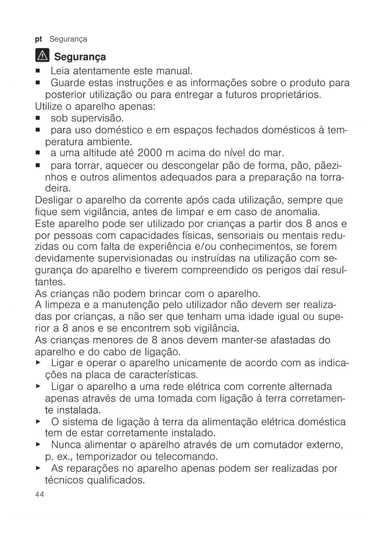 Segurança ¡ Leia atentamente este manual. ¡ Guarde estas instruções e as informações sobre o produto para posterior utilização ou para entregar a futuros proprietários. Utilize o aparelho apenas: ¡ sob supervisão. ¡ para uso doméstico e em espaços fechados domésticos à tem- peratura ambiente. ¡ a uma altitude até 2000m acima do nível do mar. ¡ para torrar, aquecer ou descongelar pão de forma, pão, pãezi- nhos e outros alimentos adequados para a preparação na torra- deira. Desligar o aparelho da corrente após cada utilização, sempre que fique sem vigilância, antes de limpar e em caso de anomalia. Este aparelho pode ser utilizado por crianças a partir dos 8 anos e por pessoas com capacidades físicas, sensoriais ou mentais redu- zidas ou com falta de experiência e/ou conhecimentos, se forem devidamente supervisionadas ou instruídas na utilização com se- gurança do aparelho e tiverem compreendido os perigos daí resul- tantes. As crianças não podem brincar com o aparelho. A limpeza e a manutenção pelo utilizador não devem ser realiza- das por crianças, a não ser que tenham uma idade igual ou supe- rior a 8 anos e se encontrem sob vigilância. As crianças menores de 8 anos devem manter-se afastadas do aparelho e do cabo de ligação. ▶ Ligar e operar o aparelho unicamente de acordo com as indica- ções na placa de características. ▶ Ligar o aparelho a uma rede elétrica com corrente alternada apenas através de uma tomada com ligação à terra corretamen- te instalada. ▶ O sistema de ligação à terra da alimentação elétrica doméstica tem de estar corretamente instalado. ▶ Nunca alimentar o aparelho através de um comutador externo, p. ex., temporizador ou telecomando. ▶ As reparações no aparelho apenas podem ser realizadas por técnicos qualificados.Segurança pt