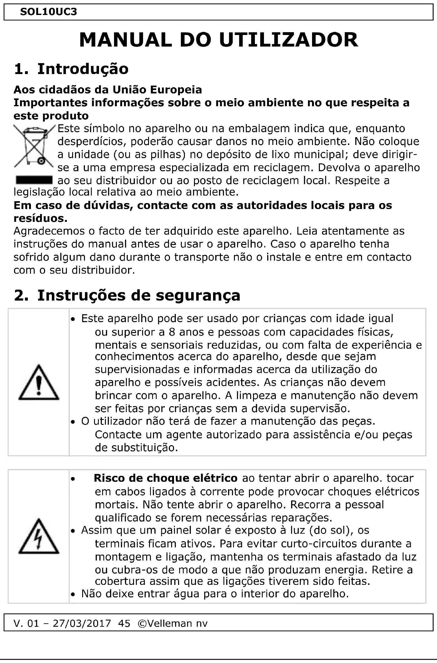 na parte final deste manual do utilizador. Familiarize-se com o funcionamento do aparelho antes de o utilizar. Por razões de segurança, estão proibidas quaisquer modificações do aparelho desde que não autorizadas. Os danos causados por modificações não autorizadas do aparelho não estão cobertos pela garantia. Utilize o aparelho apenas para as aplicações descritas neste manual. Todos os outros usos podem levar a um curto-circuito, queimaduras, eletrochoques, de colisão, etc. Utilizar o aparelho de uma forma não autorizada dará origem à anulação da garantia. Danos causados pelo não cumprimento das normas de segurança referidas neste manual anulam a garantia e o seu distribuidor não será responsável por quaisquer danos ou outros problemas daí resultantes.SOL10UC3