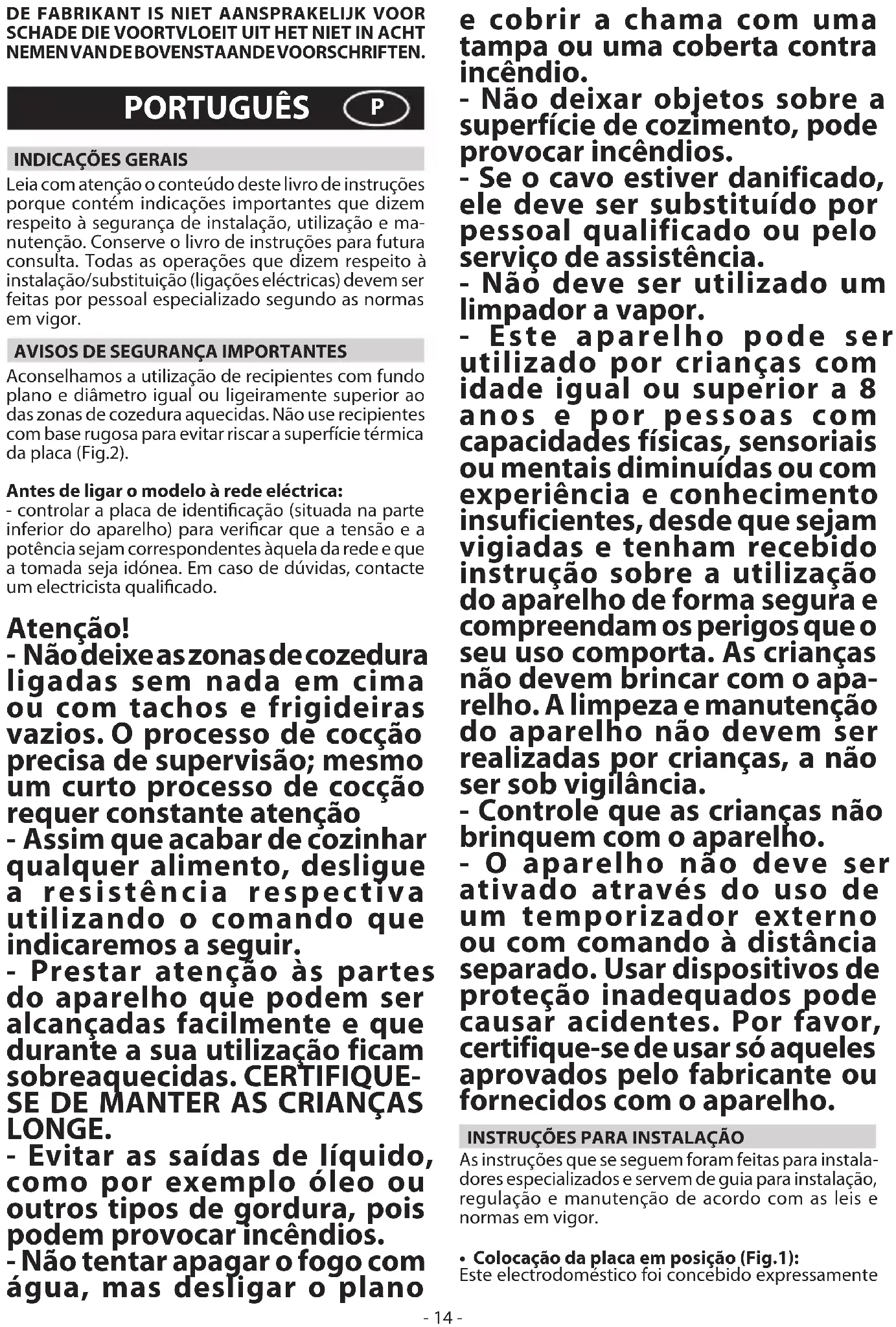 LONGE. - Evitar as saídas de líquido, como por exemplo óleo ou outros tipos de gordura, pois podem provocar incêndios. - Não tentar apagar o fogo com água, mas desligar o plano e cobrir a chama com uma tampa ou uma coberta contra incêndio. - Não deixar objetos sobre a superfície de cozimento, pode provocar incêndios. - Se o cavo estiver danificado, ele deve ser substituído por pessoal qualificado ou pelo serviço de assistência. - Não deve ser utilizado um limpador a vapor. - Este aparelho pode ser utilizado por crianças com idade igual ou superior a 8 anos e por pessoas com capacidades físicas, sensoriais ou mentais diminuídas ou com experiência e conhecimento insuficientes, desde que sejam vigiadas e tenham recebido instrução sobre a utilização do aparelho de forma segura e compreendam os perigos que o seu uso comporta. As crianças não devem brincar com o apa- relho. A limpeza e manutenção do aparelho não devem ser realizadas por crianças, a não ser sob vigilância. - Controle que as crianças não brinquem com o aparelho. - O aparelho não deve ser ativado através do uso de um temporizador externo ou com comando à distância separado. Usar dispositivos de proteção inadequados pode causar acidentes. Por favor, certifique-se de usar só aqueles aprovados pelo fabricante ou fornecidos com o aparelho.