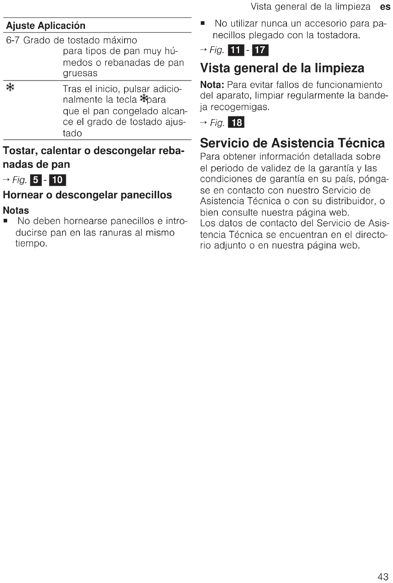 - Fig. 2 - 4 Operação Indicações gerais Respeite as indicações, de modo a tirar o maior proveito do seu aparelho. ¡ Pode parar o processo de torragem em curso a qualquer momento, premindo o botão . ¡ Se ficar preso pão nas cavidades de tor- ragem, o aparelho desliga-se automati- camente. Desligar a torradeira da toma- da, deixar arrefecer e depois retirar cui- dadosamente o pão que ficou preso. ¡ Experimente diferentes regulações do grau de torra quando utilizar o aparelho pela primeira vez, pois o resultado pode variar em função do tipo de pão e do ní- vel de humidade. ¡ Ao torrar apenas uma fatia de pão, esco- lha um grau de torra mais baixo do que para 2 fatias. ¡ A acrilamida é prejudicial à saúde e sur- ge quando prepara derivados de cereais e produtos de batata a temperaturas muito elevadas. Torre os alimentos com um tostado claro em vez de escuro e eli- mine os resíduos queimados. Regulação do grau de torra Regule o grau de torra consoante os ali- mentos e o gosto pessoal. Regulação Utilização Para aquecer apenas o pão, sem torrar, premir o botão após o início 1-2 Grau de torra baixo para ti- pos de pão seco 3-5 Grau de torra médio para ti- pos de pão húmido 6-7 Grau de torra alto para tipos de pão muito húmido ou fa- tias de pão grossas Depois do início, premir adi- cionalmente o botão , para que o pão congelado obte- nha o grau de torra regula- doVista geral da limpeza pt