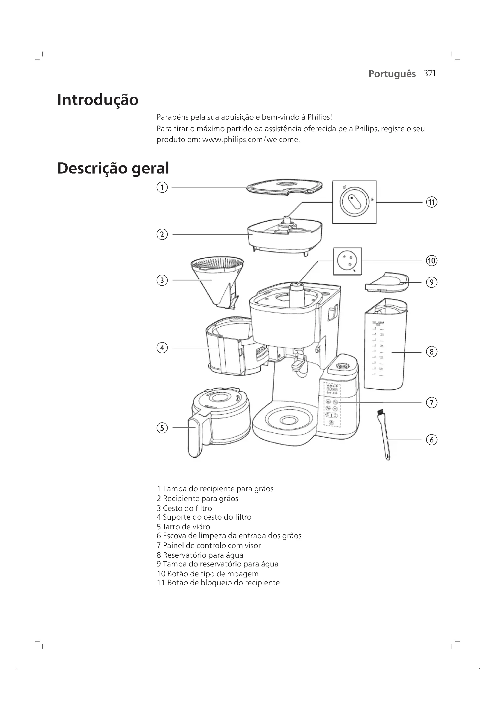 1 Tampa do recipiente para grãos 2 Recipiente para grãos 3 Cesto do filtro 4 Suporte do cesto do filtro 5 Jarro de vidro 6 Escova de limpeza da entrada dos grãos 7 Painel de controlo com visor 8 Reservatório para água 9 Tampa do reservatório para água 10 Botão de tipo de moagem 11 Botão de bloqueio do recipiente372 Português Painel de controlo Botão ligar/desligar Botão do temporizador e botão de seta para ajustar o tempo Botão iniciar/interromper Botão de limpeza Botão de intensidade do café e pré-moagem Botão de seleção de chávenas Ícone do visor Número de chávenas Modo para manter quente Café pré-moído Intensidade do café Descalcificação Alerta de limpeza manual Reserva de água baixa Temporizador373 Português Visor de indicação das horas Os dois primeiros dígitos representam as horas e os dois últimos dígitos representam os minutos. Rode o botão para a posição de desbloqueio e pode remover o recipiente para grãos do aparelho. Este botão seleciona o tipo de moagem do café, sendo que o tamanho maior indica um processamento mais grosso. Modo de jarro A função anti-pingos está disponível no modo de jarro. Nota: O processo de preparação não para quando retira o jarro. Se não voltar a colocar o jarro no aparelho dentro de 20segundos, o cesto do filtro transborda. Modo de chávena Comute manualmente o botão do modo de chávena para o modo de jarro para abrir o sistema anti- pingos para evitar pingas após a conclusão do ciclo de preparação Nota: uma caneca de cerâmica fria absorve o calor do café à medida que aquece; pré-aqueça a chávena com água quente. Importante Aviso