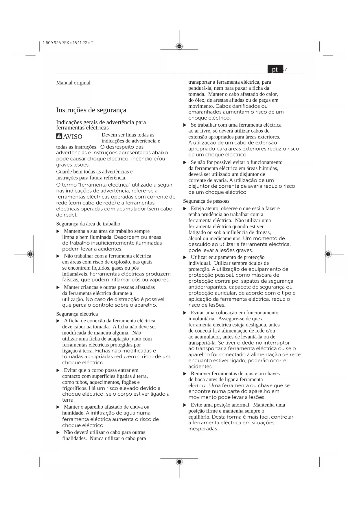 O nível de vibrações indicado nestas instruções e o valor de emissões sonoras foram medidos de acordo com um processo de medição normalizado e podem ser utilizados para a comparação de ferramentas elétricas. Também são adequados para uma avaliação provisória das emissões sonoras e de vibrações. O nível de vibrações indicado e o valor de emissões sonoras representam as aplicações principais da ferramenta elétrica. Se a ferramenta elétrica for utilizada para outras aplicações, com outras ferramentas de trabalho ou com manutenção insuficiente, é possível que o nível de vibrações e de emissões sonoras seja diferente. Isto pode aumentar sensivelmente a emissão sonora e de vibrações para o período completo de trabalho. Para uma estimação exata da emissão sonora e de vibrações, também deveriam ser considerados os períodos nos quais o aparelho está desligado ou funciona, mas não está sendo utilizado. Isto pode reduzir a emissão sonora e de vibrações durante o completo período de trabalho. Além disso também deverão ser estipuladas medidas de segurança para proteger o operador contra o efeito de vibrações, como por exemplo: manutenção de ferramentas elétricas e acessórios, manter as mãos quentes e organização dos processos de trabalho. BateriaPortuguês Carregar a bateriaPortuguês u Utilize apenas os carregadores listados nos dados técnicos. Só estes carregadores são apropriados para os baterias de lítio utilizadas para a sua ferramenta elétrica. Nota: devido a normas de transporte internacionais, as baterias de lítio são fornecidas parcialmente carregadas. Para assegurar a completa potência da bateria, a bateria deverá ser carregada completamente antes da primeira utilização. Colocar a bateriaPortuguês Insira a bateria carregada no respetivo encaixe, até que esta esteja engatada. Retirar a bateriaPortuguês Para retirar a bateria, pressione a respetiva tecla de desbloqueio e puxe a bateria para fora. Não empregue força. A bateriapossui 2 níveis de travamento, que devem evitar, que a bateria caia, caso a tecla de desbloqueio da bateriaseja premida por acaso. Enquanto a bateria estiver dentro da ferramenta elétrica, ela é mantida em posição por uma mola. Indicador do nível de carga da bateriaPortuguês Os LEDs verdes do indicador do nível de carga da bateria indicam o nível de carga da bateria. Por motivos de segurança, a consulta do nível de carga só é possível com a ferramenta elétrica parada. Prima a tecla para o indicador do nível de carga da bateria ou para visualizar o nível de carga. Isto também é possível com a bateria removida. 50 pt 1 609 92A 7RX • 15.11.22 • TSe, depois de premir a tecla para o indicador do nível de carga da bateria, não se acender qualquer LED, a bateria tem defeito e tem de ser substituída. Tipo de bateria GBA 18V...Português LED Capacidade Luz permanente 3× verde 60–100% Luz permanente 2× verde 30–60% Luz permanente 1× verde 5–30% Luz intermitente 1× verde 0–5% Tipo de bateria ProCORE18V...Português LED Capacidade Luz permanente 5× verde 80–100% Luz permanente 4× verde 60–80% Luz permanente 3× verde 40–60% Luz permanente 2× verde 20–40% Luz permanente 1× verde 5–20% Luz intermitente 1× verde 0–5% Indicações sobre o manuseio ideal da bateriaPortuguês Proteger a bateria contra humidade e água. Armazene a bateria apenas na faixa de temperatura de −20°C a 50°C. Por exemplo, não deixe a bateria dentro do automóvel no verão. Limpar de vez em quando as aberturas de ventilação da bateria com um pincel macio, limpo e seco. Um tempo de funcionamento reduzido após o carregamento indica que a bateria está gasta e que deve ser substituída. Observe as indicações sobre a eliminação de forma ecológica. MontagemPortuguês u A bateria deverá ser retirada antes de todos os trabalhos na ferramenta elétrica (p. ex. manutenção, troca de ferramenta etc.) e antes de transportar ou de armazenar a mesma. Há perigo de ferimentos se o interruptor de ligar/desligar for acionado involuntariamente. Introduzir/substituir a lâmina da serra de fitaPortuguês u Para a montagem da lâmina de serra de fita é necessário usar luvas de proteção. Há perigo de ferimentos em caso de contacto com a lâmina de serra de fita. u Use sempre óculos de proteção. Os óculos de proteção reduzem o risco de ferimentos. Colocar a lâmina de serra de fita (verfigurasA–E)Português Solte os dois grampos de fecho (4) ❶ e levante a cobertura(13) ❷. Rode a alavanca(9) em 180° no sentido de rotação até ao batente. Conduza a lâmina da serra de fita(6) sequencialmente nos guias da lâmina de serra(7). A parte de trás da lâmina de serra tem de tocar na chumaceira, na parte inferior das guias da lâmina de serra(7). Conduza a lâmina de serra de fita(6) sequencialmente em volta dos dois rolos(15). Rode a alavanca(9) em 180° de volta até ao batente. Verifique se a lâmina de serra de fita(6) se encontra corretamente posicionada em torno dos dois rolos(15). Feche a cobertura(13) até que os grampos de fecho(4) engatem. u Verifique se a lâmina de serra de fita(6) está corretamente assente. Ligue e desligue várias vezes a ferramenta elétrica por breves instantes. Uma lâmina de serra de fita incorretamente montada pode-se soltar e causar-lhe ferimentos. Aspiração de pó/de aparasPortuguês Pós de materiais como por exemplo, tintas que contém chumbo, alguns tipos de madeira, minerais e metais, podem ser nocivos à saúde. O contacto ou a inalação dos pós pode provocar reações alérgicas e/ou doenças nas vias respiratórias do utilizador ou das pessoas que se encontrem por perto. Certos pós, como por exemplo pó de carvalho e faia são considerados como sendo cancerígenos, especialmente quando juntos com substâncias para o tratamento de madeiras (cromato, preservadores de madeira). Material que contém asbesto só deve ser process