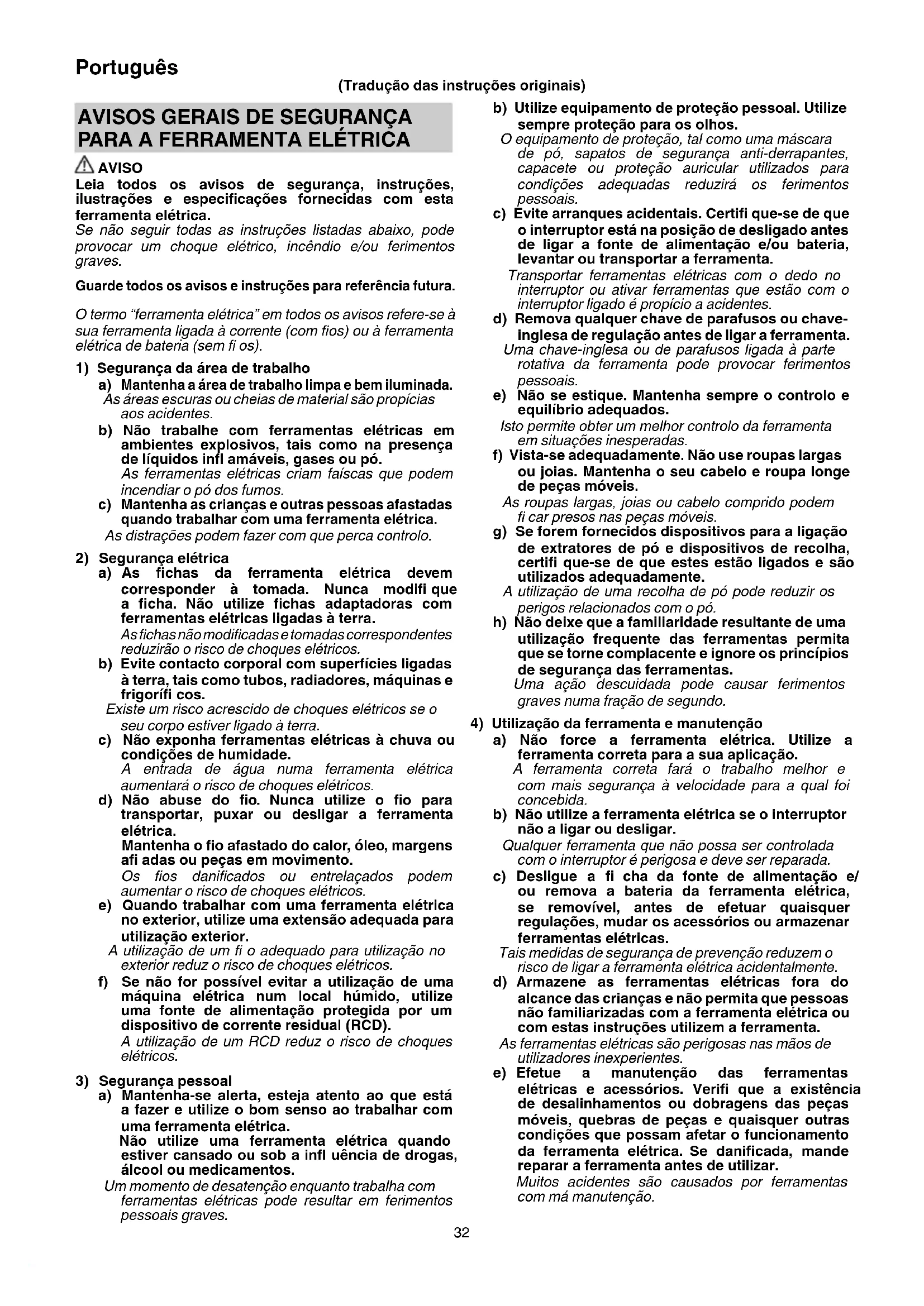 Utilize a ferramenta elétrica, acessórios e brocas de ferramentas, etc., de acordo com estas instruções, tendo em consideração as condições de trabalho e o trabalho a ser efetuado. A utilização de uma ferramenta elétrica para operações diferentes das previstas pode resultar numa situação perigosa. h) Mantenha as pegas e as superfícies de manuseamento secas, limpas e livres de óleo e graxa. Pegas de manuseamento escorregadias não permitem a manipulação segura e controlo da ferramenta em situações inesperadas.