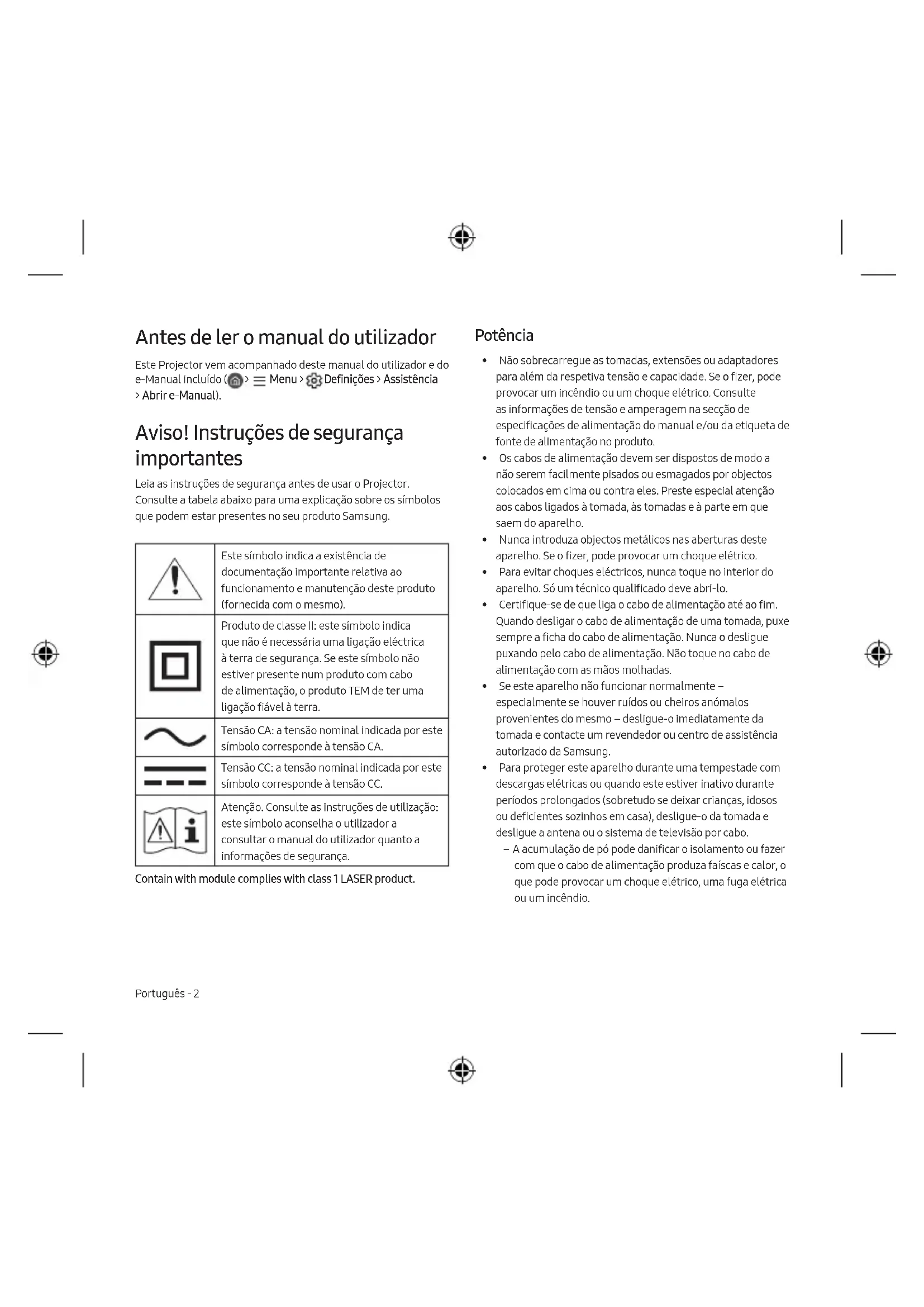 - Es posible que estas licencias no se admitan según el modelo o la zona geográfica. The terms HDMI and HDMI High-Definition Multimedia Interface, and the HDMI Logo are trademarks or registered trademarks of HDMI Licensing Administrator, Inc. in the United States and other countries.Esta página se ha dejado intencionadamente en blanco.Português - 2 Antes de ler o manual do utilizador Este Projector vem acompanhado deste manual do utilizador e do e-Manual incluído ( > Menu > Definições > Assistência > Abrir e-Manual). Aviso! Instruções de segurança importantes Leia as instruções de segurança antes de usar o Projector. Consulte a tabela abaixo para uma explicação sobre os símbolos que podem estar presentes no seu produto Samsung. Este símbolo indica a existência de documentação importante relativa ao funcionamento e manutenção deste produto (fornecida com o mesmo). Produto de classe II: este símbolo indica que não é necessária uma ligação eléctrica à terra de segurança. Se este símbolo não estiver presente num produto com cabo de alimentação, o produto TEM de ter uma ligação fiável à terra. Tensão CA: a tensão nominal indicada por este símbolo corresponde à tensão CA. Tensão CC: a tensão nominal indicada por este símbolo corresponde à tensão CC. Atenção. Consulte as instruções de utilização: este símbolo aconselha o utilizador a consultar o manual do utilizador quanto a informações de segurança. Contain with module complies with class 1 LASER product. Potência