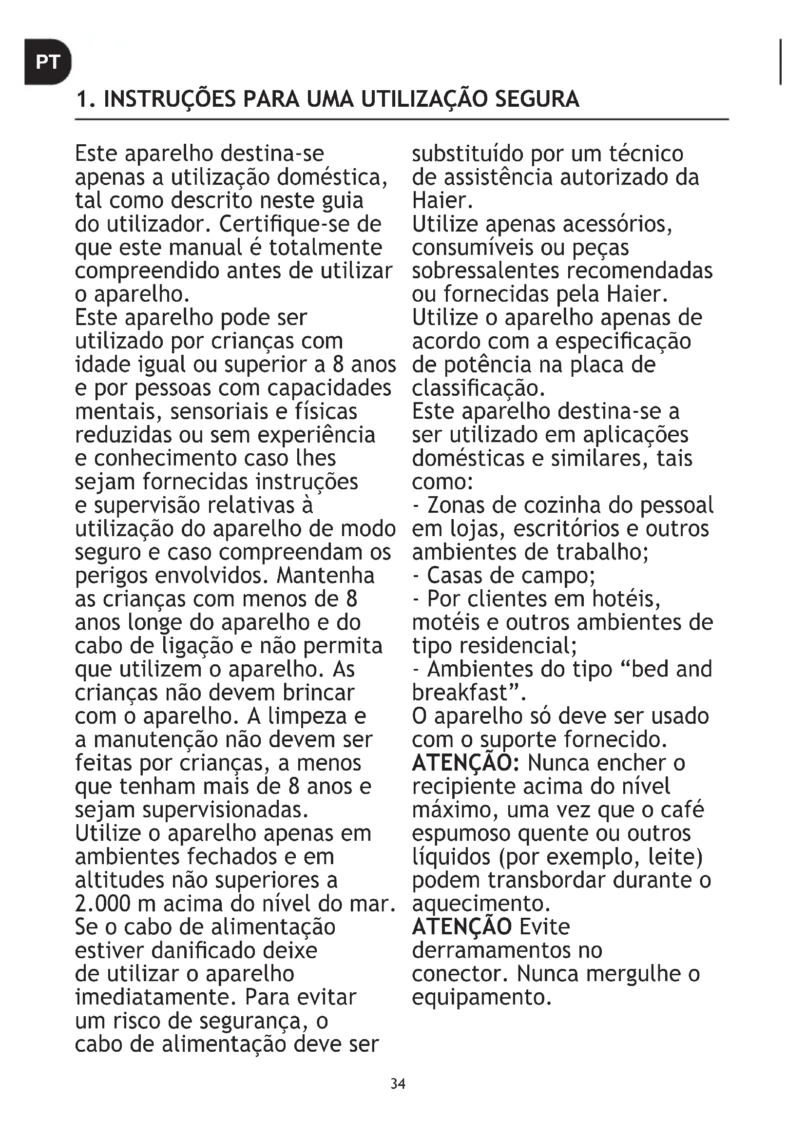 Se o cabo de alimentação estiver danicado deixe de utilizar o aparelho imediatamente. Para evitar um risco de segurança, o cabo de alimentação deve ser substituído por um técnico de assistência autorizado da Haier. Utilize apenas acessórios, consumíveis ou peças sobressalentes recomendadas ou fornecidas pela Haier. Utilize o aparelho apenas de acordo com a especicação de potência na placa de classicação. Este aparelho destina-se a ser utilizado em aplicações domésticas e similares, tais como: - Zonas de cozinha do pessoal em lojas, escritórios e outros ambientes de trabalho; - Casas de campo; - Por clientes em hotéis, motéis e outros ambientes de tipo residencial; - Ambientes do tipo “bed and breakfast”. O aparelho só deve ser usado com o suporte fornecido. ATENÇÃO: Nunca encher o recipiente acima do nível máximo, uma vez que o café espumoso quente ou outros líquidos (por exemplo, leite) podem transbordar durante o aquecimento. ATENÇÃO Evite derramamentos no conector. Nunca mergulhe o equipamento.