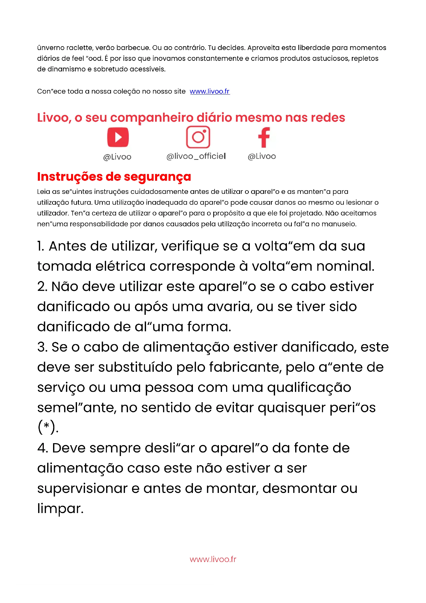 Obrigado por ter escolhido Livoo! A tua varinha, o teu barbecue, os teus fones não são simples objetos, são uma extensão de ti que te permite que te aproximes dos teus, que os reúnas, que rias e que partilhes. A ambição de Livoo consiste em ajudar-te a viver a tua vida a fundo independentemente das tuas vontades ao longo de todo o ano. PTwww.livoo.fr Inverno raclette, verão barbecue. Ou ao contrário. Tu decides. Aproveita esta liberdade para momentos diários de feel good. É por isso que inovamos constantemente e criamos produtos astuciosos, repletos de dinamismo e sobretudo acessíveis. Conhece toda a nossa coleção no nosso site www.livoo.fr Livoo, o seu companheiro diário mesmo nas redes