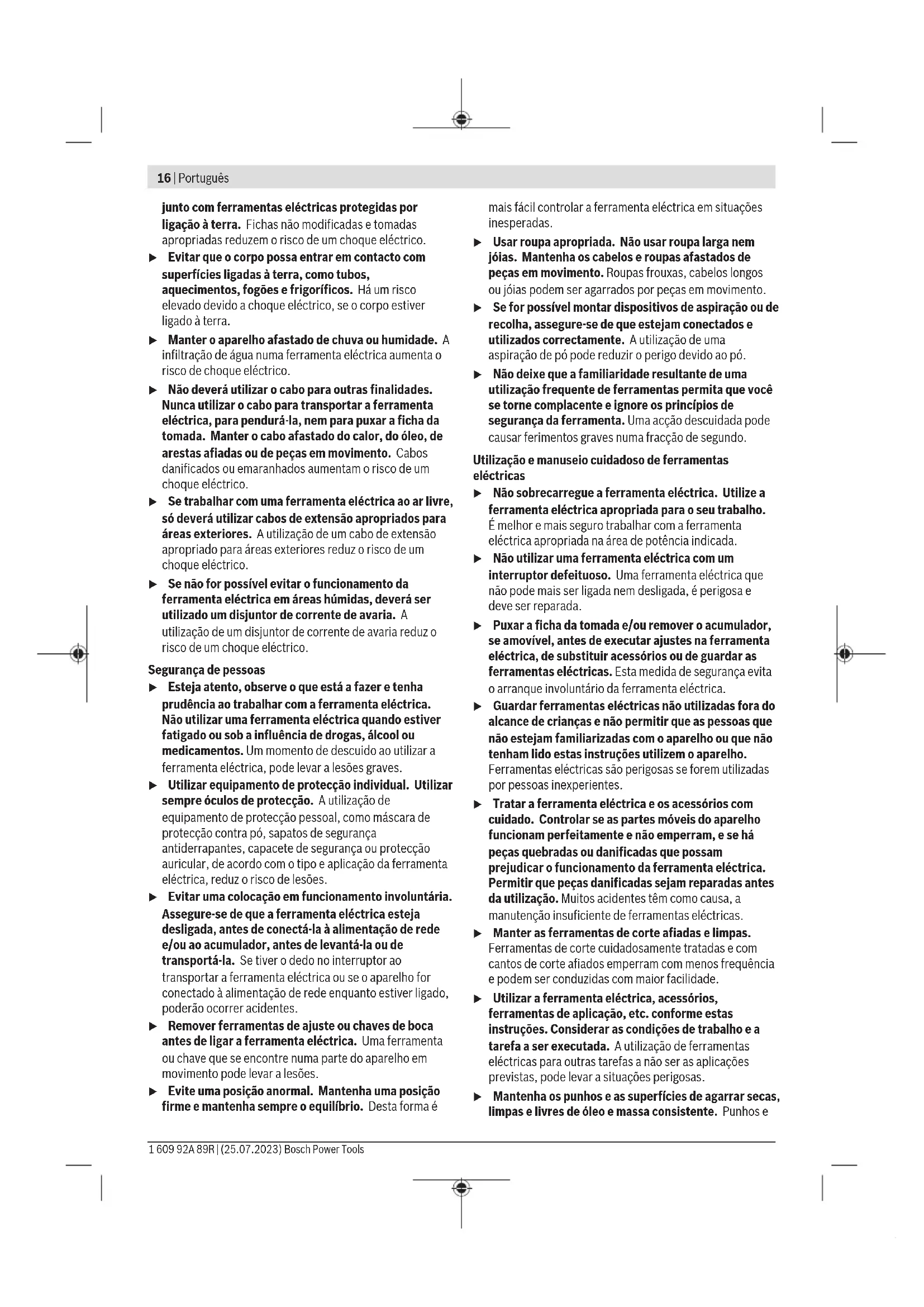 u Controle a posição firme da lâmina de serra. Uma lâmina de serra solta pode cair e causar feridas. Retirar a lâmina de serra (verfiguraB) Soltar o parafuso(8) da fixação da lâmina de serra ➊ e retirar a lâmina de serra(10) ➋. Proteção contra o arranque de aparas (acessórios) (verfiguraC) A proteção contra o arranque de aparas (15) (acessório) pode evitar o lascar da superfície ao serrar madeira. A proteção contra o arranque de aparas só pode ser usada com determinados tipos de lâmina de serra e apenas com um ângulo de corte de 0°. A placa base (7), ao serrar com a proteção contra o arranque de aparas, não pode ser deslocada para trás para serrar rente à borda. Pressione a proteção contra o arranque de aparas (15) a partir de baixo na placa base (7). Aspiração de pó/de aparas Pós de materiais como por exemplo, tintas que contém chumbo, alguns tipos de madeira, minerais e metais, podem ser nocivos à saúde. O contacto ou a inalação dos pós pode provocar reações alérgicas e/ou doenças nas vias respiratórias do utilizador ou das pessoas que se encontrem por perto. Certos pós, como por exemplo pó de carvalho e faia são considerados como sendo cancerígenos, especialmente quando juntos com substâncias para o tratamento de madeiras (cromato, produtos de proteção da madeira). Material que contém asbesto só deve ser processado por pessoal especializado. – Se possível deverá usar um dispositivo de aspiração de pó apropriado para o material. – Assegurar uma boa ventilação do local de trabalho. – É recomendável usar uma máscara de proteção respiratória com filtro da classe P2. Observe as diretivas para os materiais a serem processados, vigentes no seu país. u Evite a acumulação de pó no local de trabalho. Pós podem entrar levemente em ignição. Tampa de cobertura Monte a tampa de cobertura (12), antes de ligar a ferramenta elétrica a um sistema de aspiração de pó. Coloque a tampa de cobertura (12) na ferramenta elétrica de forma a que os suportes engatem nos entalhes da caixa. Retire a tampa de cobertura (12) para trabalhos sem aspiração de pó e para cortes em meia-esquadria. Para tal é necessário comprimir a capa na altura dos dispositivos de fixação laterais puxar pela frente para retirá-la. 1 609 92A 89R | (25.07.2023) Bosch Power ToolsPortuguês | 19 Conectar a aspiração de pó Insira uma mangueira de aspiração (5) (acessório) no bocal de aspiração (6). Ligue a mangueira de aspiração (5) a um aspirador (acessório). Encontra um resumo da ligação aos diferentes aspiradores no final deste manual. Para uma excelente aspiração utilize se possível uma proteção contra o arranque de aparas (15). O aspirador de pó deve ser apropriado para o material a ser trabalhado. Utilizar um aspirador especial para aspirar pó que seja extremamente nocivo à saúde, cancerígeno ou seco. Funcionamento Modos de operação u Antes de todos trabalhos na ferramenta elétrica deverá puxar a ficha de rede da tomada. Ajustar o ângulo de meia-esquadria (verfiguraD) A placa base (7) pode ser oscilada até 45° para a direita para cortes em meia-esquadria. A proteção contra o arranque de aparas (15) não pode ser usada em cortes em meia-esquadria. – Retire a proteção contra o arranque de aparas (15). – Solte o parafuso (16) e empurre a placa base (7) ligeiramente no sentido do cabo de rede. – Para o ajuste de ângulos de meia-esquadria precisos, a placa base tem pontos de engate à direita e à esquerda de 0° e 45°. Oscile a placa base (7) de acordo com a escala (17) para a posição desejada. Outros ângulo de meia- esquadria podem ser ajustados com um medidor de ângulos. – A seguir empurre a placa base (7) até ao batente no sentido da lâmina de serra (10). – Reaperte o parafuso (16). Deslocar a placa base (verfiguraE) Para serrar rente à borda pode deslocar a placa base (7) para trás. Desapertar por completo o parafuso(16) com a chave sextavada interior(4). Retirar o parafuso juntamente com a régua de perfil(18). Levantar a placa base(7). Deslocar a placa base no sentido do cabo de rede para que o orifício do furo para serrar junto à borda(22) fique por cima do orifício roscado na carcaça da ferramenta elétrica. A saliência de posicionamento(19) tem de engatar em simultâneo na abertura(20) da placa base. Colocar o parafuso(16) com a régua de perfil(18) no orifício roscado e apertar o parafuso. Serrar com a placa base(7) deslocada só é possível com um ângulo de meia-esquadria de 0°. Para além disso, a guia paralela com cortador circular(25) (acessórios) e a proteção contra o arranque de aparas(15) não podem ser usadas. Colocação em funcionamento u Observar a tensão de rede! A tensão da fonte de corrente elétrica tem de coincidir com a que consta na chapa de identificação da ferramenta elétrica. Ferramentas elétricas marcadas para 230V também podem ser operadas com 220V. Ligar/desligar u Certifique-se de que consegue acionar o interruptor de ligar/desligar sem ter de soltar o punho. Para ligar a ferramenta elétrica, prima o interruptor de ligar/ desligar (2). Para fixar o interruptor de ligar/desligar (2) mantenha-o pressionado e prima também o sistema de retenção (3). Para desligar a ferramenta elétrica, solte o botão de ligar/ desligar (2). Fixado o interruptor de ligar/desligar (2), prima-o primeiro e solte-o depois. Pré-selecionar número de cursos Com a roda de pré-seleção do número de cursos (1) pode pré-selecionar o número de cursos e pode alterar o mesmo durante o funcionamento. O número de cursos necessário depende do material e das condições de trabalho e pode ser determinado por tentativas. Recomendamos uma redução do número de cursos ao colocar a lâmina de serra na peça, assim como ao serrar plástico e alumínio. O número de cursos ajustáveis em seis níveis permite a adequação perfeita da velocidade de corte, do rendimento d