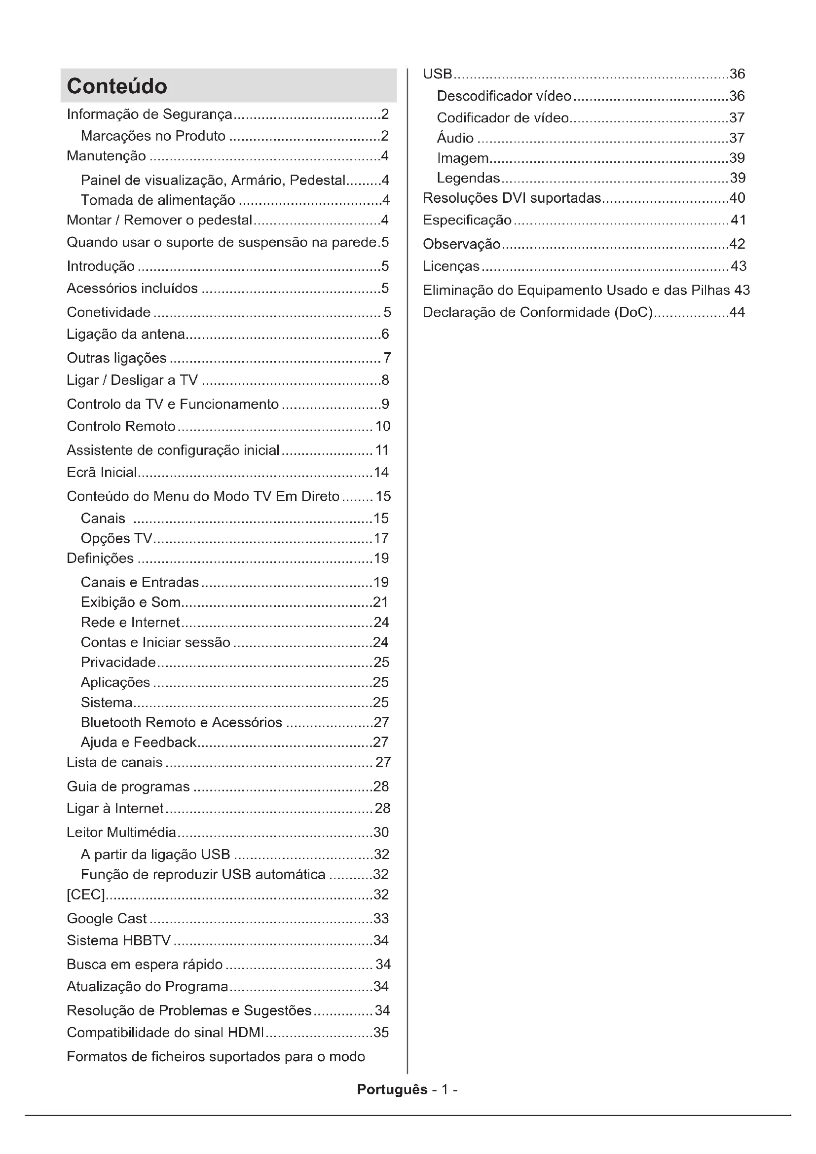 cionar Cancelar para sair. Bluetooth Remoto e Acessórios Pode utilizar os acessórios Bluetooth, tal como o controlo remoto (dependendo do modelo do controlo remoto), auscultadores, teclados ou controladores de jogos com a sua TV Google. Adicionar dispositivos para os usar com a sua TV. Selecionar a opção Controlo Remoto Bluetooth e Acessórios no menu Denições e pemir OK para ver as opções disponíveis. Selecionar a opção Emparelhar acessório e premir OK para iniciar a procura de dispositivos disponíveis de modo a emparelhar os mesmos com a sua TV. Denir o dispositivo para o modo emparelhamento. Serão reconhecidos e indicados os dispositivos disponíveis ou será exibido o pedido de emparelhamento. Para começar o emparelhamento, selecionar o seu dispositivo a partir da lista e premir OK , ou selecionar OK e premir OK quando o pedido de emparelhamento aparece. Os dispositivos ligados também serão indicados aqui. Para anular o emparelhamento de um dispositivo , selecionar o mesmo e premir OK ou o botão direcional Direito. Seguidamente selecionar a opção Esquecer e premir OK. Depois selecionar OK e premir OK novamente para desemparelhar o dispositivo da TV. Se tiver vários dispositivos emparelhados com a sua TV, pode usar a opção Desligar para desligar aqueles que não está a usar. Pode também mudar o nome do dispositivo ligado. Selecionar Mudar Nome e premir OK. Premir OK novamente e usar o teclado virtual para alterar o nome do dispositivo. Ajuda e Feedback Pode usar a opção Enviar feedback para enviar o seu feedback do produto para a Google. Lista de canais A TV ordena os canais memorizados na lista de canais. Premir o botão OK para abrir a lista de canais no modo de TV em Direto. Pode premir o botão direcional esquerdo para se deslocar para cima na página da lista por página ou premir o botão direcional direito para se deslocar para baixo. Para ordenar o canal ou encontrar um canal na lista de canais, premir o botão Verde para exibir as opções de Operação do Canal. Opções disponíveis são Ordenar e Encontrar. A opção Ordenar pode não estar disponível dependendo do país selecionado durante o processo de configuração inicial. Para ordenar os canais selecionar Ordenar e premir o botão OK. Selecionar uma das opções disponíveis e premir de novo. Os canais serão ordenados de acordo com a sua seleção. Para encontrar um canal selecionar Encontrar e premir o botão OK. O teclado virtual será exibido. Inserir o nome completo ou parte do mesmo ou o número do canal que pretende encontrar, selecionar o símbolo da marca de vericação no teclado e premir OK. Serão listados os resultados correspondentes.Português - 28 - Para ltrar os canais premir o botão Amarelo. Serão exibidas as opções do menu Selecionar Tipo. Pode selecionar entre as opções TV, Rádio, Gratuito, Codicado e Favoritos para ltrar a lista de canais ou selecionar a opção Todos os canais para ver todos os canais instalados na lista de canais. As opções disponíveis podem variar dependendo da seleção do operador. Nota: Se alguma opção exceto Todos os canais for selecionada no menu Selecionar Tipo, pode apenas deslocar- se através dos canais que estão atualmente indicados na lista de canais usando os botões Programa +/- no controlo remoto. Editar os canais na lista de canais Premir o botão Vermelho no controlo remoto para aceder o menu Gestão do canal. Pode editar os canais e a lista de canais usando as opções deste menu. As opções Saltar Canal, Trocar Canal, Mover Canal, Editar Canal e Apagar Canal podem estar disponíveis. Pode aceder à Gestão do Canal a partir do menu Canais no modo de TV em Direto. Nota: As opções Trocar Canal, Mover Canal, Editar Canal e Apagar Canal ou o menu Gestão do Canal podem não estar disponíveis ou aparecer em cinzento dependendo da seleção do operador e as respetivas denições do operador. Pode desativar a denição LCN no menu canal Denições>Canais e Entradas>Canais uma vez que impede a edição do canal. Esta opção pode ser denida em Ligar por predenição dependendo do país selecionado durante o processo de conguração inicial. Gerir as listas de canais favoritos Pode criar quatro listas diferentes dos seus canais favoritos. Estas listas incluem apenas os canais que são especicados por si. Premir o botão OK para exibir a lista de canais. Para adicionar um canal de uma lista de favoritos, selecionar esse canal na lista de canais e premir o botão Azul. O menu de selecção do lista de favoritos será exibido. Selecionar a(s) lista(s) na qual pretende que o canal seja adicionado e premir OK. O canal será adicionado à lista selecionada de favoritos. Para remover um canal de uma lista de favoritos, selecionar esse canal e premir o botão Azul. O menu de selecção do lista de favoritos será exibido. Selecionar a(s) lista(s) para a qual pretende que o canal seja removido e premir OK. O canal será removido da lista selecionada de favoritos. Para denir uma das listas de canais favoritas como a lista principal de canais, premir o botão Amarelo e denir a opção Selecionar Tipo para os Favoritos. Depois selecionar a lista favorita pretendida e premir OK. De modo a mudar a posição de um canal na lista de favoritos premir o Verde, seguidamente selecionar a opção Mover e premir OK. Seguidamente usar os botões direcionais Para Cima e Para Baixo para mover o canal para a posição pretendida e depois premir OK. De modo a apagar um canal da lista de favoritos, premir o botão Verde, seguidamente selecionar a opção Apagar e premir OK. Guia de programas Através da Guia Eletrónico de Programa (EPG) função da sua TV, pode navegar na programação do evento dos canais atualmente instalados na sua lista de canais. Depende da transmissão relacionada se esta funcionalidade é suportada ou não. O Guia Eletrónico de Programa está disponível no modo TV Em Direto. Para mudar para o modo TV em Direto pode tanto pre