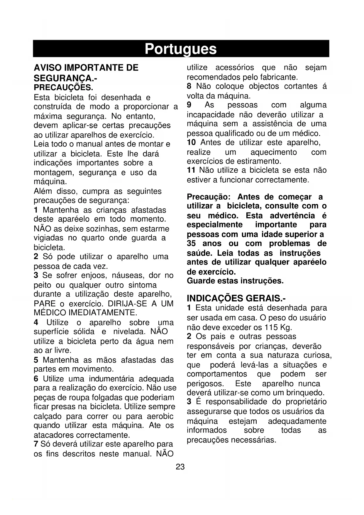 SEGURANÇA.- PRECAUÇÕES. Esta bicicleta foi desenhada e construída de modo a proporcionar a máxima segurança. No entanto, devem aplicar-se certas precauções ao utilizar aparelhos de exercício. Leia todo o manual antes de montar e utilizar a bicicleta. Este lhe dará indicações importantes sobre a montagem, segurança e uso da máquina. Além disso, cumpra as seguintes precauções de segurança: 1 Mantenha as crianças afastadas deste aparéelo em todo momento. NÃO as deixe sozinhas, sem estarme vigiadas no quarto onde guarda a bicicleta. 2 Só pode utilizar o aparelho uma pessoa de cada vez. 3 Se sofrer enjoos, náuseas, dor no peito ou qualquer outro sintoma durante a utilização deste aparelho, PARE o exercício. DIRIJA-SE A UM MÉDICO IMEDIATAMENTE. 4 Utilize o aparelho sobre uma superfície sólida e nivelada. NÃO utilize a bicicleta perto da água nem ao ar livre. 5 Mantenha as mãos afastadas das partes em movimento. 6 Utilize uma indumentária adequada para a realização do exercício. Não use peças de roupa folgadas que poderiam ficar presas na bicicleta. Utilize sempre calçado para correr ou para aerobic quando utilizar esta máquina. Ate os atacadores correctamente. 7 Só deverá utilizar este aparelho para os fins descritos neste manual. NÃO utilize acessórios que não sejam recomendados pelo fabricante. 8 Não coloque objectos cortantes á volta da máquina. 9 As pessoas com alguma incapacidade não deverão utilizar a máquina sem a assistência de uma pessoa qualificado ou de um médico. 10 Antes de utilizar este aparelho, realize um aquecimento com exercícios de estiramento. 11 Não utilize a bicicleta se esta não estiver a funcionar correctamente. Precaução: Antes de começar a utilizar a bicicleta, consulte com o seu médico. Esta advertência é especialmente importante para pessoas com uma idade superior a 35 anos ou com problemas de saúde. Leia todas as instruções antes de utilizar qualquer aparéelo de exercício. Guarde estas instruções.