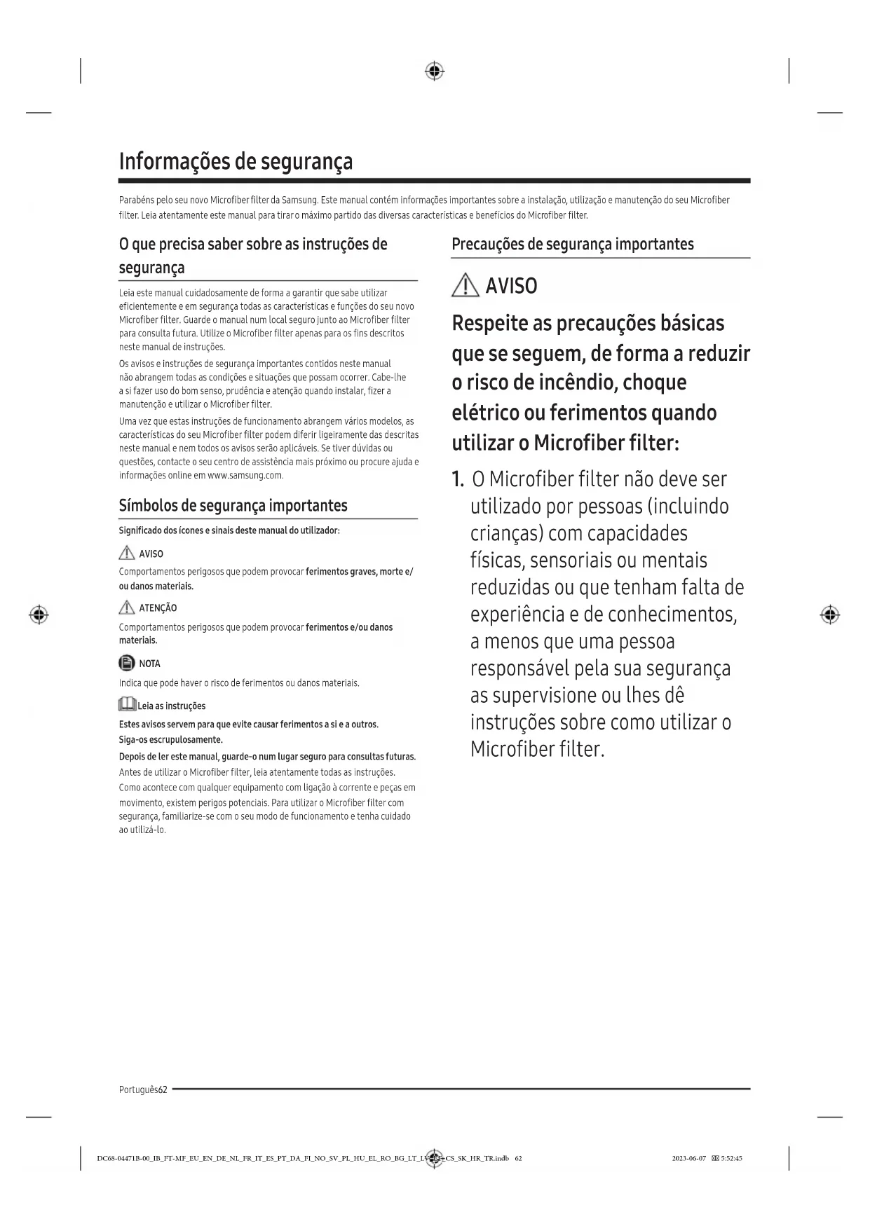 - Las dimensiones aquí indicadas pueden diferir ligeramente de las medidas reales según el método de medición. DC68-04471B-00_IB_FT-MF_EU_EN_DE_NL_FR_IT_ES_PT_DA_FI_NO_SV_PL_HU_EL_RO_BG_LT_LV_ET_CS_SK_HR_TR.indb 61 2023-06-07 5:52:44Português62 Informações de segurança Parabéns pelo seu novo Microfiber filter da Samsung. Este manual contém informações importantes sobre a instalação, utilização e manutenção do seu Microfiber filter. Leia atentamente este manual para tirar o máximo partido das diversas características e benefícios do Microfiber filter. O que precisa saber sobre as instruções de segurança Leia este manual cuidadosamente de forma a garantir que sabe utilizar eficientemente e em segurança todas as características e funções do seu novo Microfiber filter. Guarde o manual num local seguro junto ao Microfiber filter para consulta futura. Utilize o Microfiber filter apenas para os fins descritos neste manual de instruções. Os avisos e instruções de segurança importantes contidos neste manual não abrangem todas as condições e situações que possam ocorrer. Cabe-lhe a si fazer uso do bom senso, prudência e atenção quando instalar, fizer a manutenção e utilizar o Microfiber filter. Uma vez que estas instruções de funcionamento abrangem vários modelos, as características do seu Microfiber filter podem diferir ligeiramente das descritas neste manual e nem todos os avisos serão aplicáveis. Se tiver dúvidas ou questões, contacte o seu centro de assistência mais próximo ou procure ajuda e informações online em www.samsung.com. Símbolos de segurança importantes Significado dos ícones e sinais deste manual do utilizador: AVISO Comportamentos perigosos que podem provocar ferimentos graves, morte e/ ou danos materiais. ATENÇÃO Comportamentos perigosos que podem provocar ferimentos e/ou danos materiais. NOTA Indica que pode haver o risco de ferimentos ou danos materiais. Leia as instruções Estes avisos servem para que evite causar ferimentos a si e a outros. Siga-os escrupulosamente. Depois de ler este manual, guarde-o num lugar seguro para consultas futuras. Antes de utilizar o Microfiber filter, leia atentamente todas as instruções. Como acontece com qualquer equipamento com ligação à corrente e peças em movimento, existem perigos potenciais. Para utilizar o Microfiber filter com segurança, familiarize-se com o seu modo de funcionamento e tenha cuidado ao utilizá-lo. Precauções de segurança importantes AVISO Respeite as precauções básicas que se seguem, de forma a reduzir o risco de incêndio, choque elétrico ou ferimentos quando utilizar o Microfiber filter: