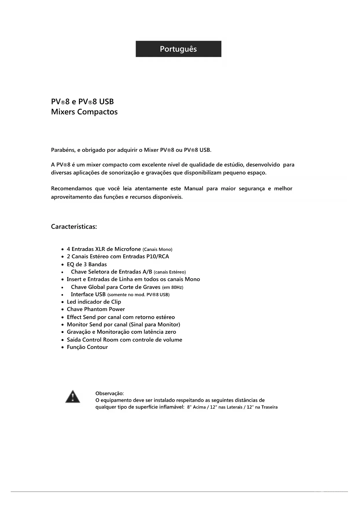 Parabéns, e obrigado por adquirir o Mixer PV®8 ou PV®8 USB. A PV®8 é um mixer compacto com excelente nível de qualidade de estúdio, desenvolvido para diversas aplicações de sonorização e gravações que disponibilizam pequeno espaço. Recomendamos que você leia atentamente este Manual para maior segurança e melhor aproveitamento das funções e recursos disponíveis. Características: 4 Entradas XLR de Microfone (Canais Mono) 2 Canais Estéreo com Entradas P10/RCA EQ de 3 Bandas Chave Seletora de Entradas A/B (canais Estéreo) Insert e Entradas de Linha em todos os canais Mono Chave Global para Corte de Graves (em 80Hz) Interface USB (somente no mod. PV®8 USB) Led indicador de Clip Chave Phantom Power Effect Send por canal com retorno estéreo Monitor Send por canal (Sinal para Monitor) Gravação e Monitoração com latência zero Saída Control Room com controle de volume Função Contour