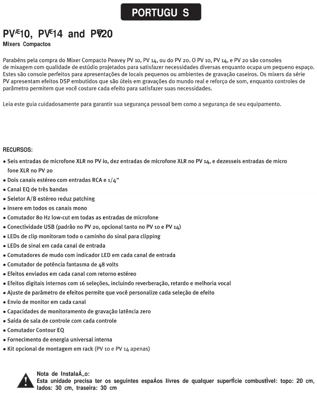 Mixers Compactos Parabéns pela compra do Mixer Compacto Peavey PV 10, PV 14, ou do PV 20. O PV 10, PV 14, e PV 20 são consoles de mixagem com qualidade de estúdio projetados para satisfazer necessidades diversas enquanto ocupa um pequeno espaço. Estes são console perfeitos para apresentações de locais pequenos ou ambientes de gravação caseiros. Os mixers da série PV apresentam efeitos DSP embutidos que são úteis em gravações do mundo real e reforço de som, enquanto controles de parâmetro permitem que você costure cada efeito para satisfazer suas necessidades. Leia este guia cuidadosamente para garantir sua segurança pessoal bem como a segurança de seu equipamento. RECURSOS: ● Seis entradas de microfone XLR no PV io, dez entradas de microfone XLR no PV 14, e dezesseis entradas de micro fone XLR no PV 20 ● Dois canais estéreo com entradas RCA e 1/4" ● Canal EQ de três bandas ● Seletor A/B estéreo reduz patching ● Insere em todos os canais mono ● Comutador 80 Hz low-cut em todas as entradas de microfone ● Conectividade USB (padrão no PV 20, opcional tanto no PV 10 e PV 14) ● LEDs de clip monitoram todo o caminho do sinal para clipping ● LEDs de sinal em cada canal de entrada ● Comutadores de mudo com indicador LED em cada canal de entrada ● Comutador de potência fantasma de 48 volts ● Efeitos enviados em cada canal com retorno estéreo ● Efeitos digitais internos com 16 seleções, incluindo reverberação, retardo e melhoria vocal ● Ajuste de parâmetro de efeitos permite que você personalize cada seleção de efeito ● Envio de monitor em cada canal ● Capacidades de monitoramento de gravação latência zero ● Saída de sala de controle com cada controle ● Comutador Contour EQ ● Fornecimento de energia universal interna ● Kit opcional de montagem em rack (PV 10 e PV 14 apenas) PORTUGU S Nota de InstalaÁ„o: Esta unidade precisa ter os seguintes espaÁos livres de qualquer superfÌcie combustÌvel: topo: 20 cm, lados: 30 cm, traseira: 30 cmGain Este controle estabelece o nível de operação nominal para o canal. O ganho de entrada pode ser ajustado em uma ampla faixa para compensar vozes suaves ou bateria muito altas. Para minimizar a razão sinal-a-ruído, o ganho deve ser definido ao nível adequado, com o Fader de canal (12) definido para