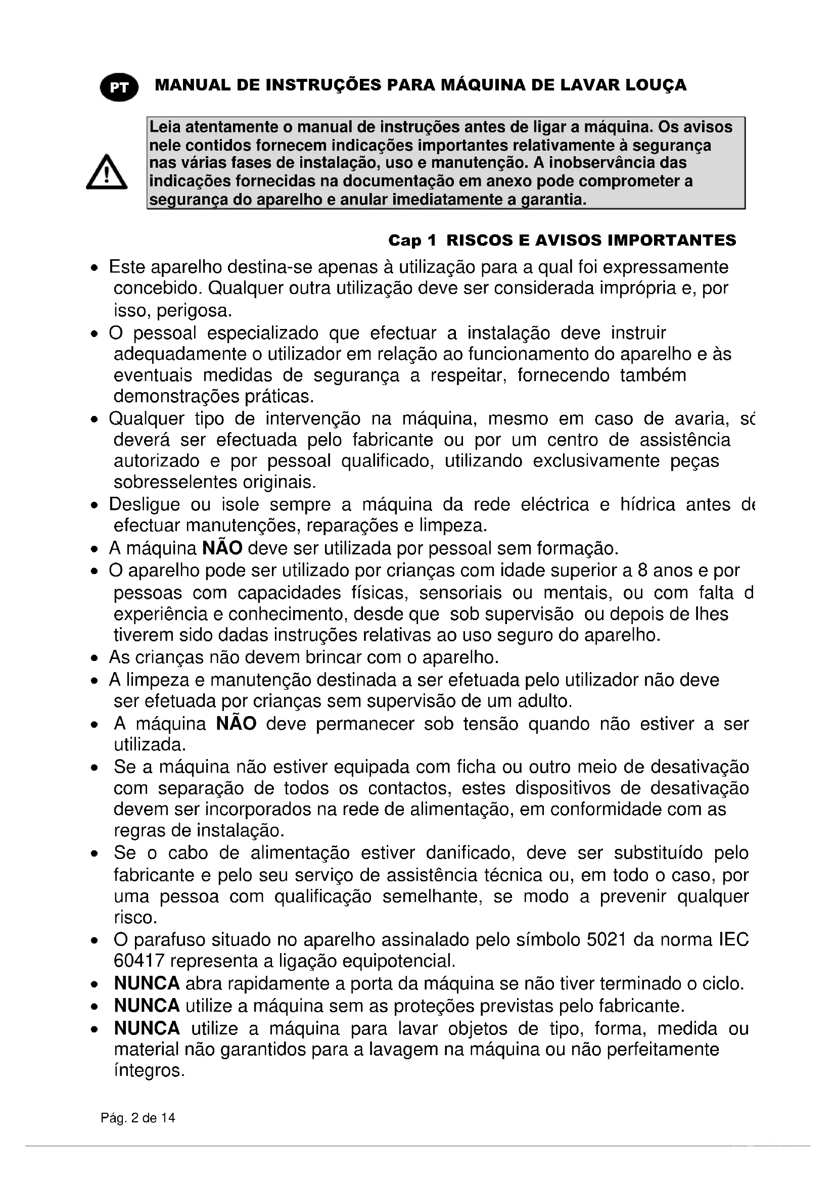 Leia atentamente o manual de instruções antes de ligar a máquina. Os avisos nele contidos fornecem indicações importantes relativamente à segurança nas várias fases de instalação, uso e manutenção. A inobservância das indicações fornecidas na documentação em anexo pode comprometer a segurança do aparelho e anular imediatamente a garantia. Cap 1 RISCOS E AVISOS IMPORTANTES Este aparelho destina-se apenas à utilização para a qual foi expressamente concebido. Qualquer outra utilização deve ser considerada imprópria e, por isso, perigosa. O pessoal especializado que efectuar a instalação deve instruir adequadamente o utilizador em relação ao funcionamento do aparelho e às eventuais medidas de segurança a respeitar, fornecendo também demonstrações práticas. Qualquer tipo de intervenção na máquina, mesmo em caso de avaria, só deverá ser efectuada pelo fabricante ou por um centro de assistência autorizado e por pessoal qualificado, utilizando exclusivamente peças sobresselentes originais. Desligue ou isole sempre a máquina da rede eléctrica e hídrica antes de efectuar manutenções, reparações e limpeza. A máquina NÃO deve ser utilizada por pessoal sem formação. O aparelho pode ser utilizado por crianças com idade superior a 8 anos e por pessoas com capacidades físicas, sensoriais ou mentais, ou com falta de experiência e conhecimento, desde que sob supervisão ou depois de lhes tiverem sido dadas instruções relativas ao uso seguro do aparelho. As crianças não devem brincar com o aparelho. A limpeza e manutenção destinada a ser efetuada pelo utilizador não deve ser efetuada por crianças sem supervisão de um adulto. A máquina NÃO deve permanecer sob tensão quando não estiver a ser utilizada. Se a máquina não estiver equipada com ficha ou outro meio de desativação com separação de todos os contactos, estes dispositivos de desativação devem ser incorporados na rede de alimentação, em conformidade com as regras de instalação. Se o cabo de alimentação estiver danificado, deve ser substituído pelo fabricante e pelo seu serviço de assistência técnica ou, em todo o caso, por uma pessoa com qualificação semelhante, se modo a prevenir qualquer risco. O parafuso situado no aparelho assinalado pelo símbolo 5021 da norma IEC 60417 representa a ligação equipotencial. NUNCA abra rapidamente a porta da máquina se não tiver terminado o ciclo. NUNCA utilize a máquina sem as proteções previstas pelo fabricante. NUNCA utilize a máquina para lavar objetos de tipo, forma, medida ou material não garantidos para a lavagem na máquina ou não perfeitamente íntegros.MANUAL DE INSTRUÇÕES PARA MÁQUINA DE LAVAR LOUÇA Pág. 3 de 14