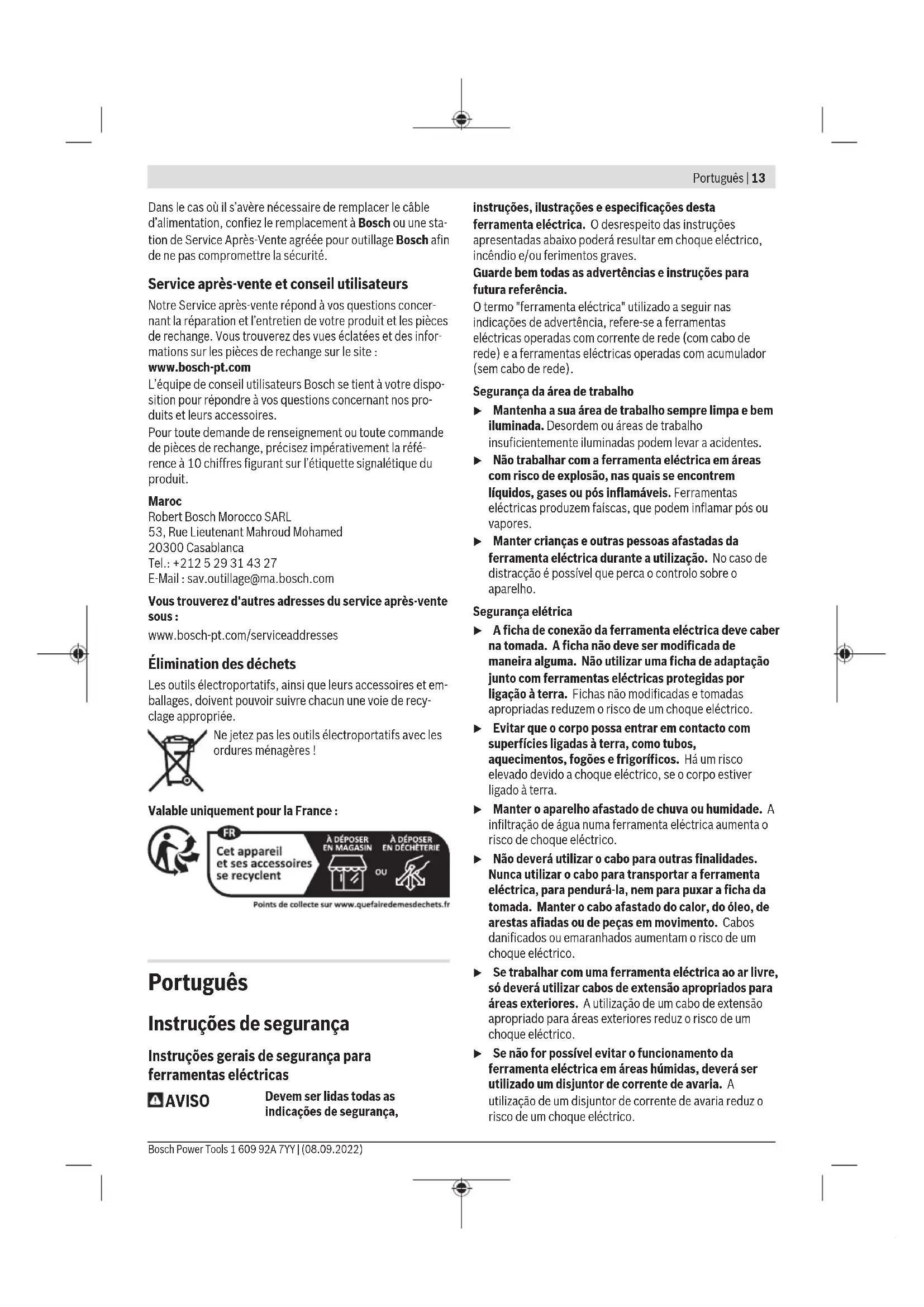 Declaração de Conformidade UE Declaramos sob nossa exclusiva responsabilidade que os produtos mencionados cumprem todas as disposições e os regulamentos indicados e estão em conformidade com as seguintes normas. Documentação técnica pertencente a: * Berbequim N.° do produto GBM 400 GBM 400 3 601 AC1 0K0 3 601 AC1 0L0 2006/42/EC 2014/30/EU 2011/65/EU EN 62841-1:2015+A11:2022 EN 62841-2-1:2018+A11:2019+ A1:2022+A12:2022