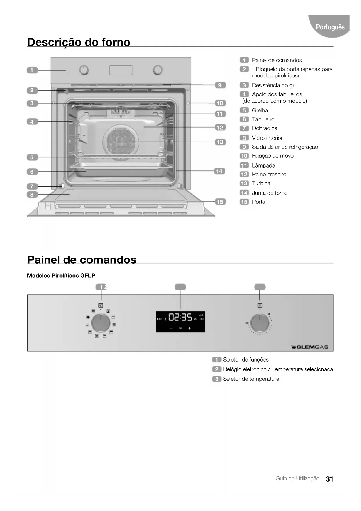 por completo, o novo estado de bloqueio da porta será apresentado no visor. No caso de o bloqueio estar ativado, o sím- bolo iluminar-se-á fixamente no visor. IMPORTANTE Para desbloquear a porta durante o cozi- nhado, coloque o seletor de funções na posição de descanso e desbloqueie a porta seguindo as instruções anteriores. Assim que a porta estiver desbloqueada, coloque o seletor de funções na posição em que estava para prosseguir com o co- zinhado Função de autolimpeza por pirólise Função disponível para os modelos GFLP. ATENÇÃO Antes de realizar o ciclo de limpeza por pi- -rólise, leia atentamente as instruções de segurança disponibilizadas no início do ma- nual de Instalação e Manutenção. Esta função permite-lhe realizar um ciclo de limpeza por pirólise, durante o qual se produz um processo de carbonização das gorduras acumuladas, devido às elevadas temperaturas que são atingidas no interior do forno. Em geral, recomenda-se a realização de uma pirólise a cada 4 ou 5 cozinhados e a utilização do programa mais adequado ao nível de suji- dade do seu forno. Em caso de maior sujidade, escolha um programa de maior duração. Durante a pirólise, a iluminação do forno per- manecerá apagada.38 Guia de Utilização