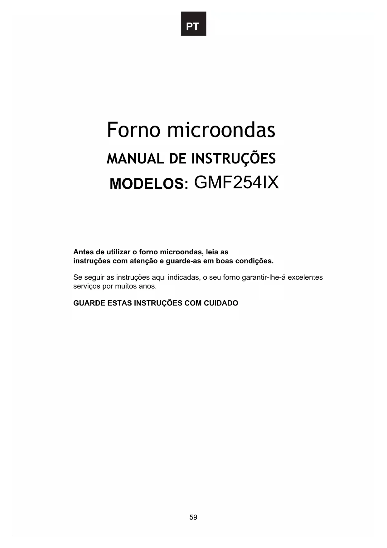 60PT Para diminuir o risco de incêndio, choque eléctrico, danos a pessoas ou exposição excessiva às radiações microondas durante a utilização do electrodoméstico, recomendamos que siga escrupulosamente as precauções básicas, nomeadamente as seguintes: 1.Atenção! Líquidos ou outros alimentos não deverão ser aquecidos em recipientes hermeticamente fechados, porque podem explodir. 2.Atenção! É perigoso para todos, excepto técnicos autorizados, remover a cobertura de segurança que garante protecção contra exposição a radiações microondas.