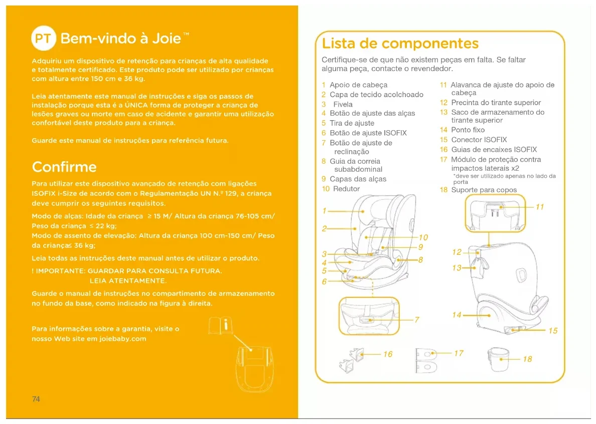 Adquiriu um dispositivo de retenção para crianças de alta qualidade e totalmente certificado. Este produto pode ser utilizado por crianças com altura entre 150 cm e 36 kg.Leia atentamente este manual de instruções e siga os passos de instalação porque esta é a ÚNICA forma de proteger a criança de lesões graves ou morte em caso de acidente e garantir uma utilização confortável deste produto para a criança.Guarde este manual de instruções para referência futura. Confirme Para utilizar este dispositivo avançado de retenção com ligações ISOFIX i-Size de acordo com o Regulamentação UN N.º 129﹐ a criança deve cumprir os seguintes requisitos.Modo de alças: Idade da criança 15 M/ Altura da criança 76-105 cm/ Peso da criança 22 kg;Modo de assento de elevação: Altura da criança 100 cm-150 cm/ Peso da criança 36 kg;Leia todas as instruções deste manual antes de utilizar o produto.! IMPORTANTE: GUARDAR PARA CONSULTA FUTURA.LEIA ATENTAMENTE.Guarde o manual de instruções no compartimento de armazenamento no fundo da base﹐ como indicado na figura à direita.Para informações sobre a garantia﹐ visite o nosso Web site em joiebaby.com Lista de componentes 1 Apoio de cabeça2 Capa de tecido acolchoado3 Fivela4 Botão de ajuste das alças 5 Tira de ajuste6 Botão de ajuste ISOFIX7 Botão de ajuste de reclinação8 Guia da correia subabdominal9 Capas das alças10 Redutor11 Alavanca de ajuste do apoio de cabeça12 Precinta do tirante superior13 Saco de armazenamento do tirante superior14 Ponto fixo15 Conector ISOFIX16 Guias de encaixes ISOFIX17 Módulo de proteção contra impactos laterais x2*deve ser utilizado apenas no lado da porta18 Suporte para coposCertifique-se de que não existem peças em falta. Se faltar alguma peça, contacte o revendedor.