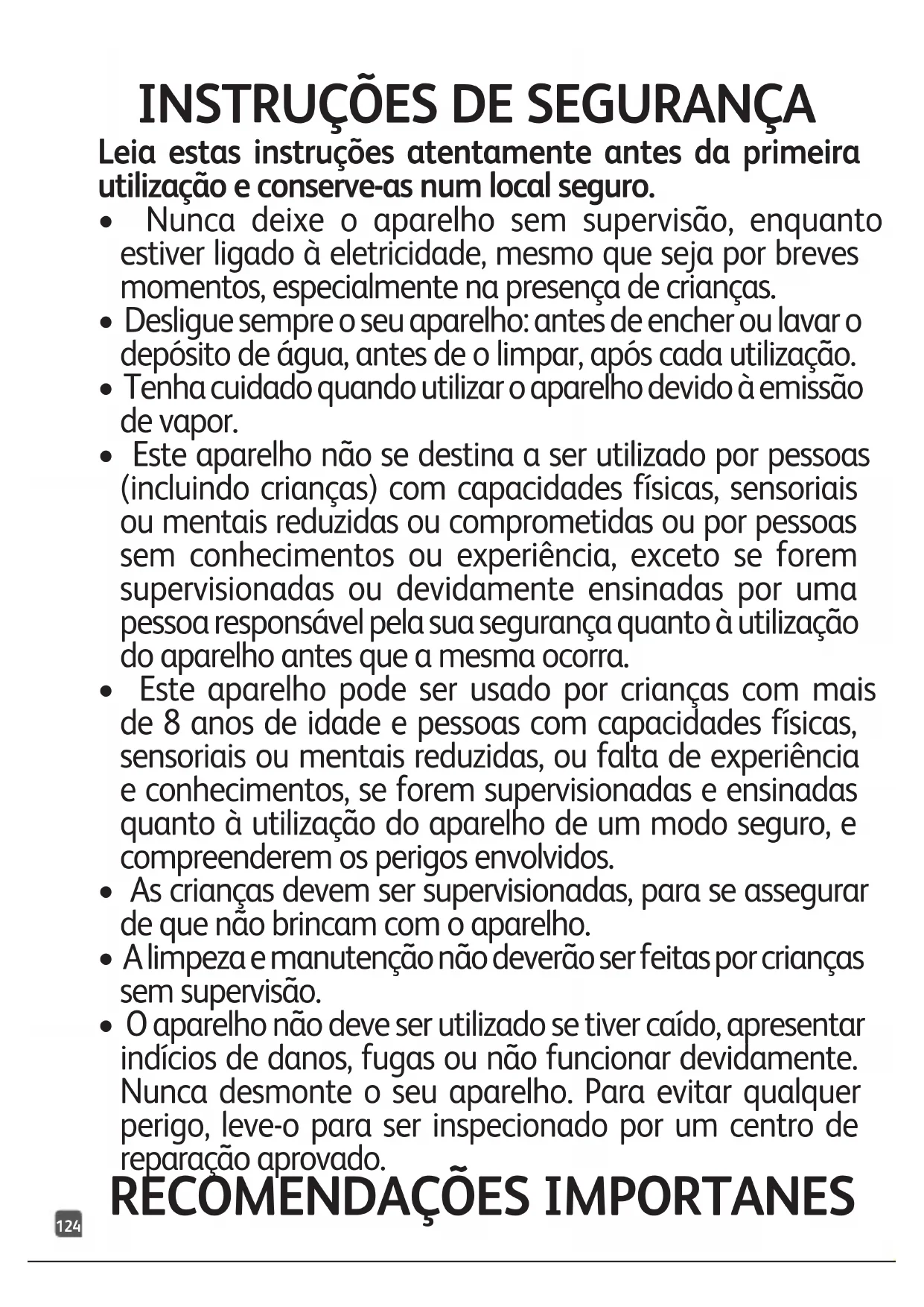 - Este aparelho não se destina a ser utilizado por pessoas (incluindo crianças) com capacidades físicas, sensoriais ou mentais reduzidas ou comprometidas ou por pessoas sem conhecimentos ou experiência, exceto se forem supervisionadas ou devidamente ensinadas por uma pessoa responsável pela sua segurança quanto à utilização do aparelho antes que a mesma ocorra.