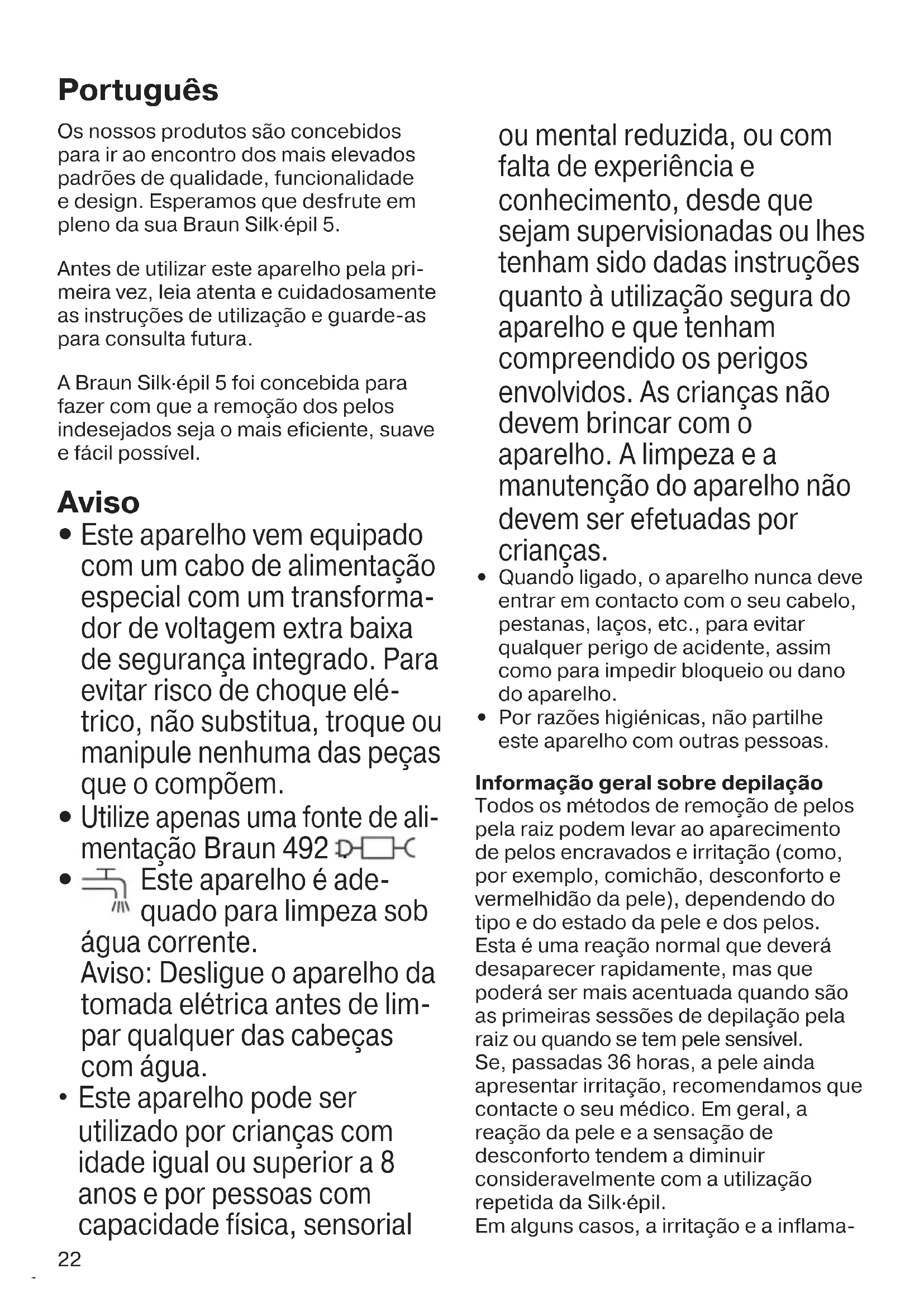 e colocar o acessório aparador (I). d Limpeza: Não limpe a lâmina de corte (II) com o pincel , pois isso pode danificar a lâmina. e As peças de corte precisam ser lubrificadas regularmente a cada 3 meses. f Substitua a estrutura da lâmina (II) e bloco de corte (III), quando notar um desempenho reduzido. As peças de substituição podem ser obtidas a partir de seu revendedor ou Centro de Atendimento ao Cliente ou via www.service.braun.com Braun. Não utilize a cabeça de corte caso a lâmina esteja danificada. Nota ambiental Este produto contém baterias recarregáveis. Com o objetivo de proteger o meio ambiente, por favor não deite o produto no lixo doméstico, no final da sua vida útil coloque-o nos recipientes específicos dos ecopontos, à disposição no seu país. Sujeito a alterações sem aviso prévio. Garantia Os nossos produtos dispõem de uma garantia de 2 anos a partir da data de compra. Qualquer defeito do aparelho imputável, quer aos materiais, quer ao fabrico, que torne necessário reparar, substituir peças ou trocar de aparelho dentro de período de garantia não terá custos adicionais. A garantia não cobre avarias por utilização indevida, funcionamento a voltagem diferente da indicada, ligação a uma tomada de corrente elétrica incorreta, rutura, utilização ou desgaste normal, defeitos com um efeito insignificante no valor ou no funcionamento do produto. A garantia perderá o seu efeito no caso de serem efetuadas reparações por pessoas não autorizadas ou se não forem utilizados acessórios originais Braun. A garantia só é válida se a data de com- pra for confirmada pela apresentação da fatura ou documento de compra corres- pondente. Esta garantia é válida para todos os países onde este produto seja distribuído pela Braun ou por um distribuidor Braun autorizado. No caso de reclamação ao abrigo de garantia, dirija-se ao Serviço de Assistência Técnica Oficial Braun mais próximo: www.service.braun.com. Só para Portugal Apoio ao consumidor: para localizar o seu serviço Braun mais próximo ou no caso de surgir alguma dúvida relativamente ao funcionamento deste produto, contacte-nos por favor pelo telefone 808 20 00 33. 90340813_SE5_Power_MN.indd 2590340813_SE5_Power_MN.indd 25 02.06.22 10:4902.06.22 10:4926 I nostri prodotti sono progettati per soddisfare i più alti standard di qualità, funzionalità e design. Si prega di leggere attentamente le istru- zioni di uso prima di utilizzare l’apparecchio e conservarle per una consultazione futura. Braun Silk·épil 5 è stato progettato per rendere la rimozione dei peli superflui il più efficiente, delicata e semplice possibile. Avvertenza