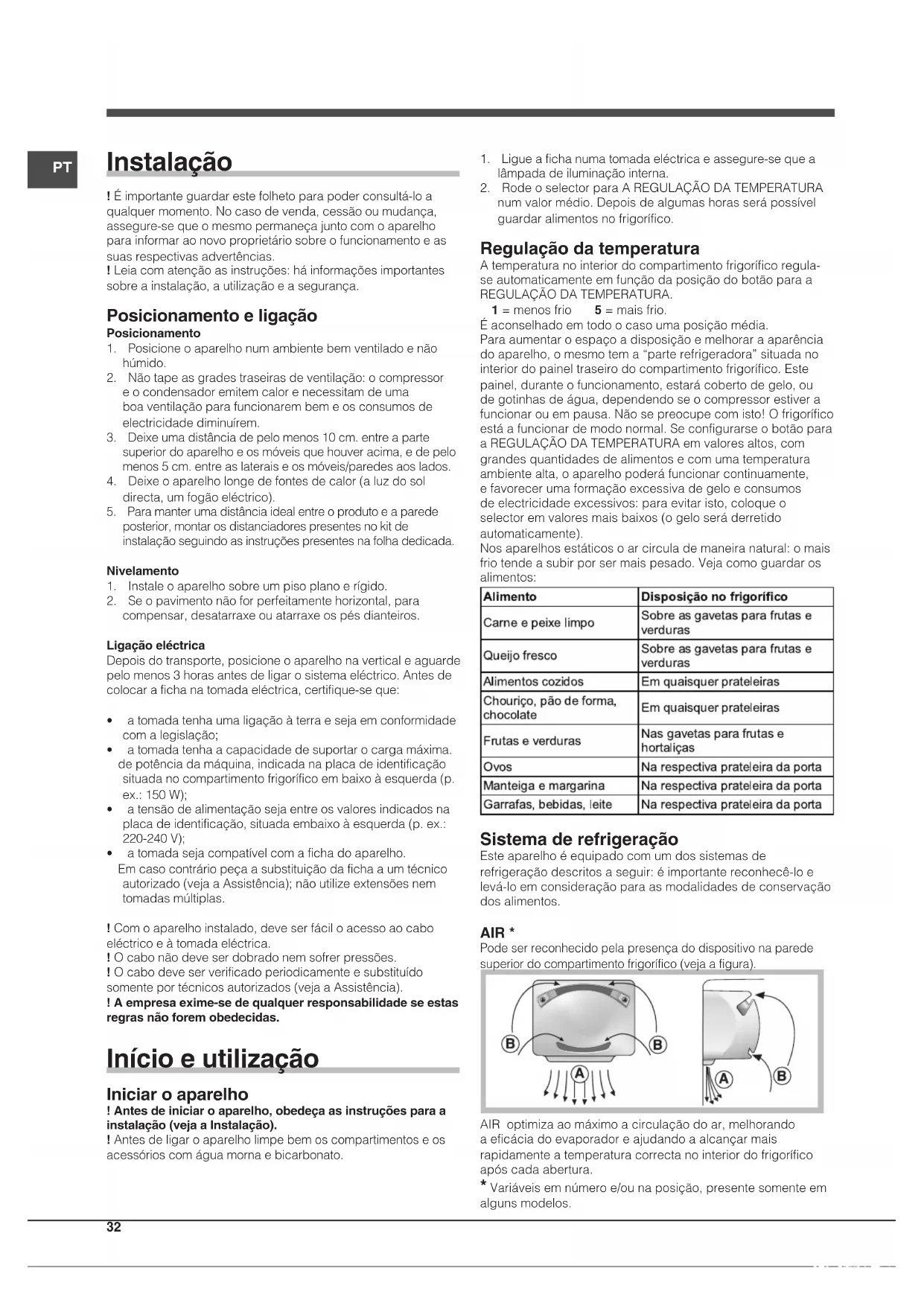 numvalormédio.Depoisdealgumashorasserápossível guardaralimentosnofrigorífico. Regulação da temperatura Atemperaturanointeriordocompartimentofrigoríficoregula- seautomaticamenteemfunçãodaposiçãodobotãoparaa REGULAÇÃODATEMPERATURA. 1 =menosfrio 5=maisfrio. Éaconselhadoemtodoocasoumaposiçãomédia. Paraaumentaroespaçoadisposiçãoemelhoraraaparência doaparelho,omesmotema“parterefrigeradora”situadano interiordopaineltraseirodocompartimentofrigorífico.Este painel,duranteofuncionamento,estarácobertodegelo,ou degotinhasdeágua,dependendoseocompressorestivera funcionarouempausa.Nãosepreocupecomisto!Ofrigorífico estáafuncionardemodonormal.Seconfigurarseobotãopara aREGULAÇÃODATEMPERATURAemvaloresaltos,com grandesquantidadesdealimentosecomumatemperatura ambientealta,oaparelhopoderáfuncionarcontinuamente, efavorecerumaformaçãoexcessivadegeloeconsumos deelectricidadeexcessivos:paraevitaristo,coloqueo selectoremvaloresmaisbaixos(ogeloseráderretido automaticamente). Nosaparelhosestáticosoarcirculademaneiranatural:omais friotendeasubirporsermaispesado.Vejacomoguardaros alimentos: Sistema de refrigeração Esteaparelhoéequipadocomumdossistemasde refrigeraçãodescritosaseguir:éimportantereconhecê-loe levá-loemconsideraçãoparaasmodalidadesdeconservação dosalimentos. AIR * Podeserreconhecidopelapresençadodispositivonaparede superiordocompartimentofrigorífico(vejaafigura). AIRoptimizaaomáximoacirculaçãodoar,melhorando aeficáciadoevaporadoreajudandoaalcançarmais rapidamenteatemperaturacorrectanointeriordofrigorífico apóscadaabertura. *Variáveisemnúmeroe/ounaposição,presentesomenteem algunsmodelos.PT