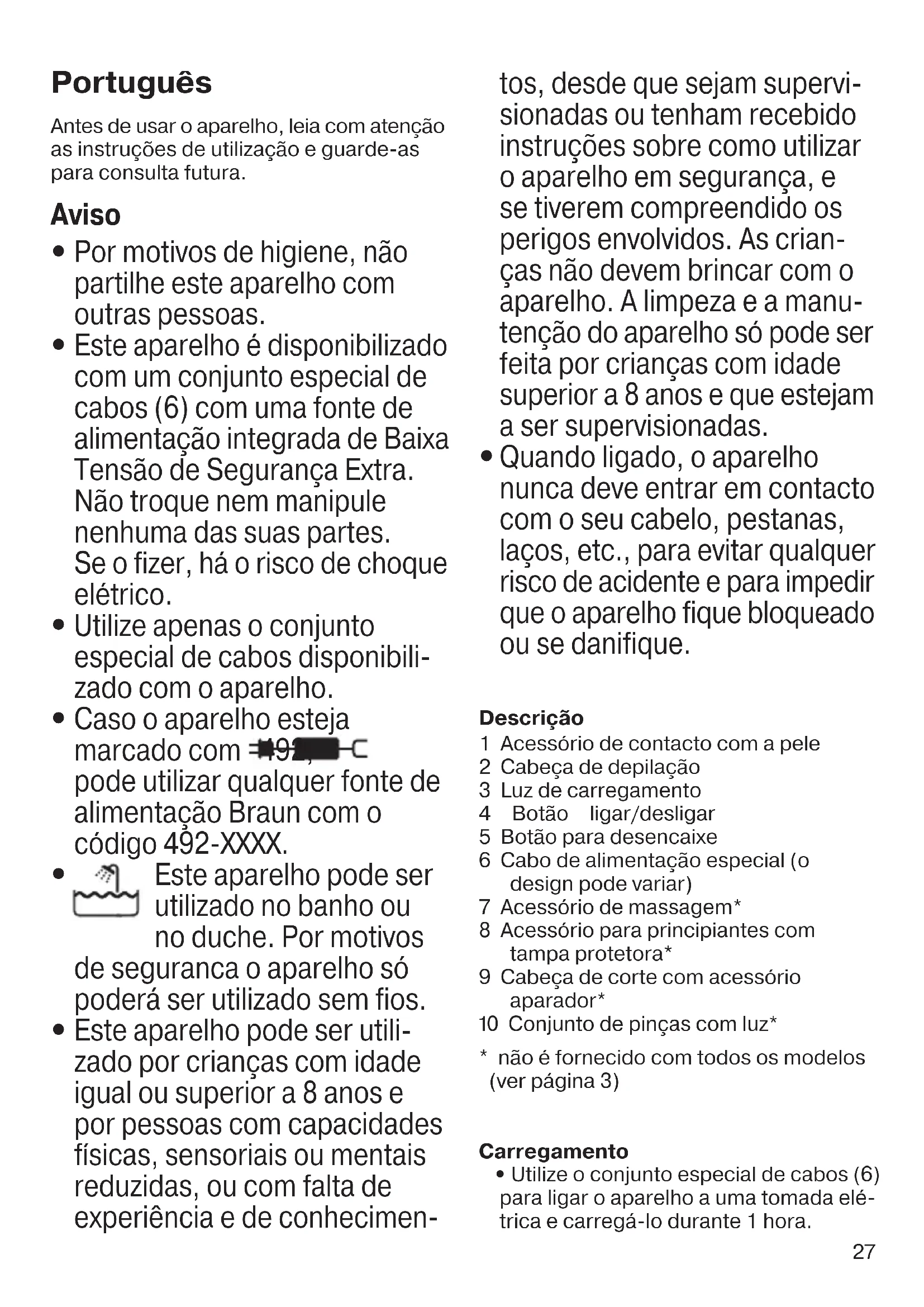 Quando ligado, o aparelho nunca deve entrar em contacto com o seu cabelo, pestanas, laços, etc., para evitar qualquer risco de acidente e para impedir que o aparelho fique bloqueado ou se danifique. Descrição 1 Acessório de contacto com a pele 2 Cabeça de depilação 3 Luz de carregamento 4 Botão ligar/desligar 5 Botão para desencaixe 6 Cabo de alimentação especial (o design pode variar) 7 Acessório de massagem* 8 Acessório para principiantes com tampa protetora* 9 Cabeça de corte com acessório aparador* 0 Conjunto de pinças com luz*