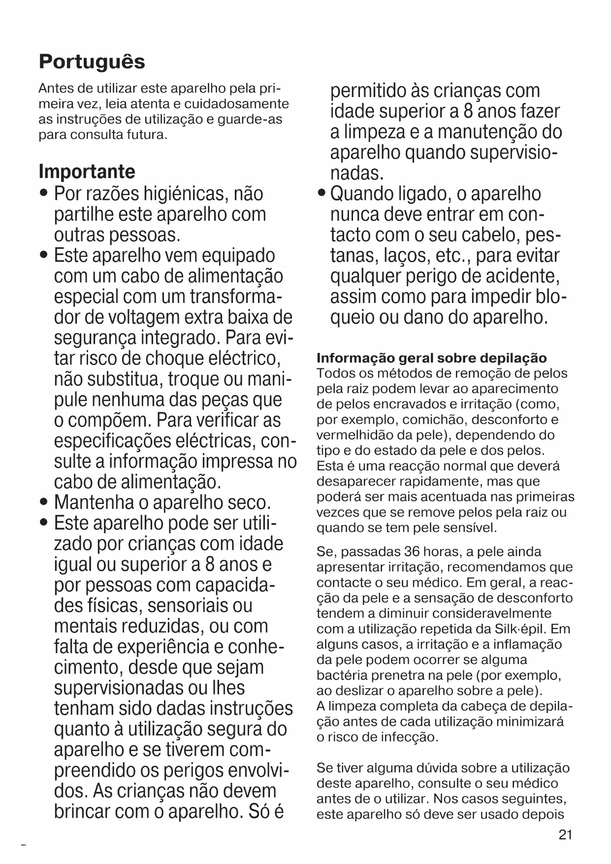 Quando ligado, o aparelho nunca deve entrar em con- tacto com o seu cabelo, pes- tanas, laços, etc., para evitar qualquer perigo de acidente, assim como para impedir blo- queio ou dano do aparelho. Informação geral sobre depilação Todos os métodos de remoção de pelos pela raiz podem levar ao aparecimento de pelos encravados e irritação (como, por exemplo, comichão, desconforto e vermelhidão da pele), dependendo do tipo e do estado da pele e dos pelos. Esta é uma reacção normal que deverá desaparecer rapidamente, mas que poderá ser mais acentuada nas primeiras vezces que se remove pelos pela raiz ou quando se tem pele sensível. Se, passadas 36 horas, a pele ainda apresentar irritação, recomendamos que contacte o seu médico. Em geral, a reac- ção da pele e a sensação de desconforto tendem a diminuir consideravelmente com a utilização repetida da Silk·épil. Em alguns casos, a irritação e a inflamação da pele podem ocorrer se alguma bactéria prenetra na pele (por exemplo, ao deslizar o aparelho sobre a pele). A limpeza completa da cabeça de depila- ção antes de cada utilização minimizará o risco de infecção. Se tiver alguma dúvida sobre a utilização deste aparelho, consulte o seu médico antes de o utilizar. Nos casos seguintes, este aparelho só deve ser usado depois 91618385_SE_3273_3274_GROCERY_S6-60.indd 2191618385_SE_3273_3274_GROCERY_S6-60.indd 21 22.08.17 08:3022.08.17 08:30 CSS APPROVED Effective Date 25Aug2017 GMT - Printed 22Nov2017 Page 21 of 6022 de consultar o seu médico: – eczema, feridas, inflamações da pele, tal como foliculite (folículos de pelos purulentos) e varizes, – perto de verrugas, – imunidade reduzida da pele como, por exemplo, diabetes mellitus, durante a gravidez, síndroma de Raynaud, – hemofilia, candidíase ou imunodefi- ciência. A depilação é mais fácil e confortável quando os pelos atingem o comprimento ideal de 2–5 mm. Se os pelos estiverem mais compridos, recomendamos que faça primeiro uma depilação de corte (ver secção B) e depile os pelos mais pequenos, que voltarem a crescer nova- mente, passada 1 semana. É possível que os pelos finos ao crescerem de novo não alcancem a superfície da pele. O uso regular de esponjas de massagem (por exemplo, depois do duche) ou peelings de esfoliação ajuda a evitar que os pelos encravem, dado que a suave acção da esfoliação elimina as células mortas da camada superior da pele e os pelos finos podem crescer naturalmente através da superfície da pele. Descrição 1 Acessório rolos de massagem 2 Cabeça de depilação com conjunto de pinças 3 Botões de libertação da cabeça 4 Botão ligar/desligar com luz incorporada 5 Tomada 6 Cabo de alimentação especial 7 Cabeça de corte com acessório aparador A Como se depilar