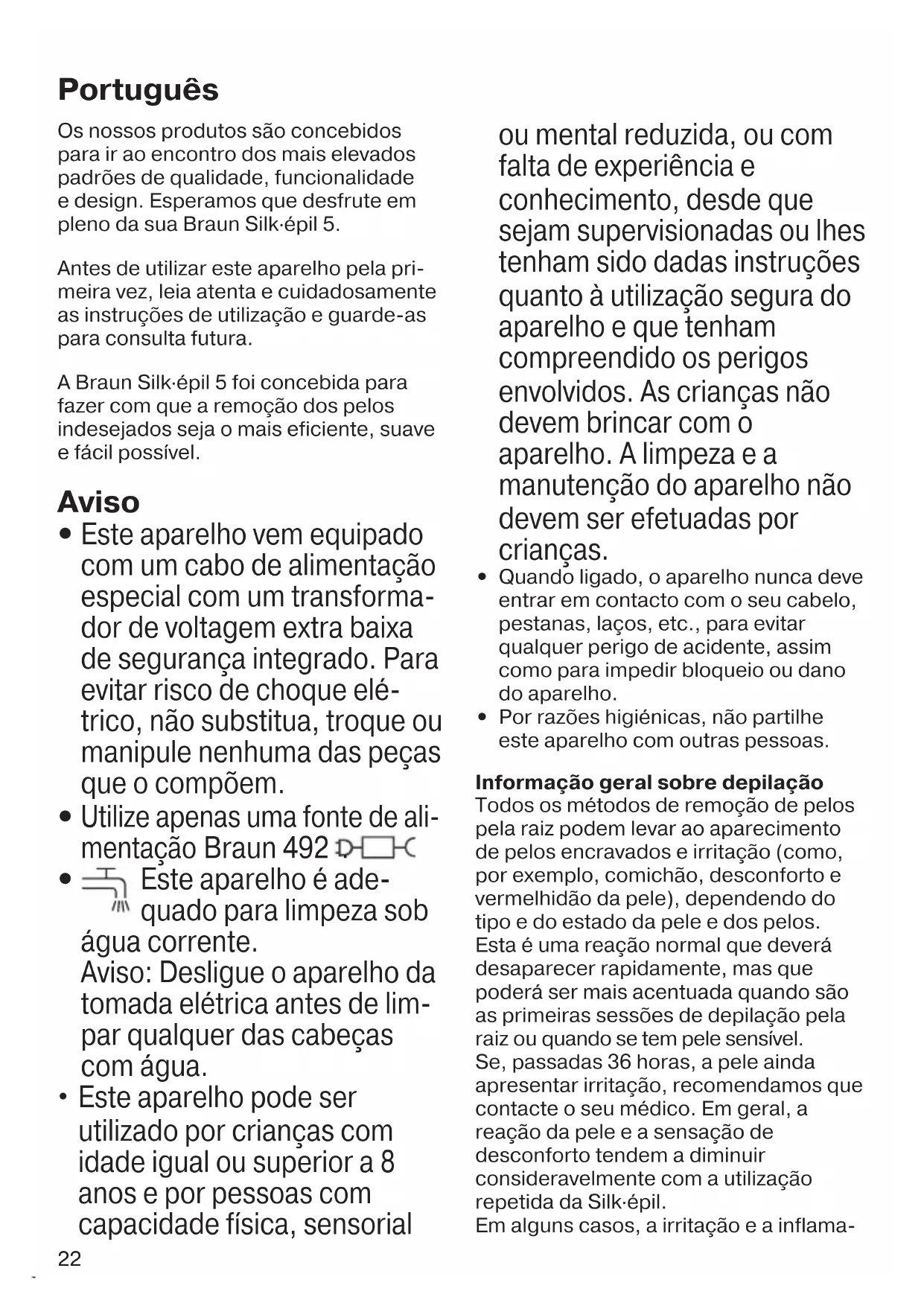 - Por razões higiénicas, não partilhe este aparelho com outras pessoas. Informação geral sobre depilação Todos os métodos de remoção de pelos pela raiz podem levar ao aparecimento de pelos encravados e irritação (como, por exemplo, comichão, desconforto e vermelhidão da pele), dependendo do tipo e do estado da pele e dos pelos. Esta é uma reação normal que deverá desaparecer rapidamente, mas que poderá ser mais acentuada quando são as primeiras sessões de depilação pela raiz ou quando se tem pele sensível. Se, passadas 36 horas, a pele ainda apresentar irritação, recomendamos que contacte o seu médico. Em geral, a reação da pele e a sensação de desconforto tendem a diminuir consideravelmente com a utilização repetida da Silk·épil. Em alguns casos, a irritação e a inflama- Português 90340813_SE5_Power_MN.indd 2290340813_SE5_Power_MN.indd 22 02.06.22 10:4902.06.22 10:4923 ção da pele podem ocorrer quando alguma bacteria penetra na pele (por exemplo, ao deslizar o aparelho sobre a pele). A limpeza completa da cabeça de depilação antes de cada utilização minimizará o risco de infeção. Se tiver alguma dúvida sobre a utilização deste aparelho, consulte o seu médico antes de o utilizar. Nos casos seguintes, este aparelho só deve ser usado depois de consultar o seu médico: – eczema, feridas, inflamações da pele, tal como foliculite (folículos de pelos purulentos) e varizes, – zonas com verrugas ou pintas, – imunidade reduzida da pele como, por exemplo, diabetes mellitus, durante a gravidez, síndroma de Raynaud, hemo- filia, candidíase ou imunodeficiência. Alguns conselhos úteis Se nunca usou uma depiladora, ou se não se depilou durante um grande período de tempo, a sua pele poderá levar um período curto de tempo a adaptar-se à depilação. O desconforto sentido no início diminuirá consideravel- mente com o uso repetido à medida que a pele se adapta ao processo. A depilação é mais fácil e confortável quando os pelos atingem o comprimento ideal de 2-5 mm. Se os pelos estiverem mais compridos, recomendamos que faça primeiro uma depilação de corte (ver secção B) e depile os pelos mais curtos, que voltarem a crescer nova- mente, passada 1 semana. Ao depilar pela primeira vez, é aconsel- hável fazer a depilação ao final do dia, para que qualquer vermelhidão possível possa desaparecer durante a noite. Para acalmar a pele, recomendamos que aplique um creme hidratante depois da depilação. É possível que os pelos finos ao cresce- rem de novo não alcancem a superfície da pele. O uso regular de esponjas de massagem (por exemplo, depois do duche) ou peelings de esfoliação ajudam a evitar que os pelos encravem, dado que a suave ação da esfoliação elimina as células mortas da camada superior da pele e os pelos finos podem crescer naturalmente através da superfície da pele. Descrição 1a Sistema de massagem de alta frequência 1b Acessório de máximo contacto com a pele* 2 Cabeça de depilação com conjunto de pinças 3 Luz 4 Botão ligar/desligar 5 Botão de libertação 6 Cabo de alimentação especial 7 Cabeça de corte com acessório aparador*