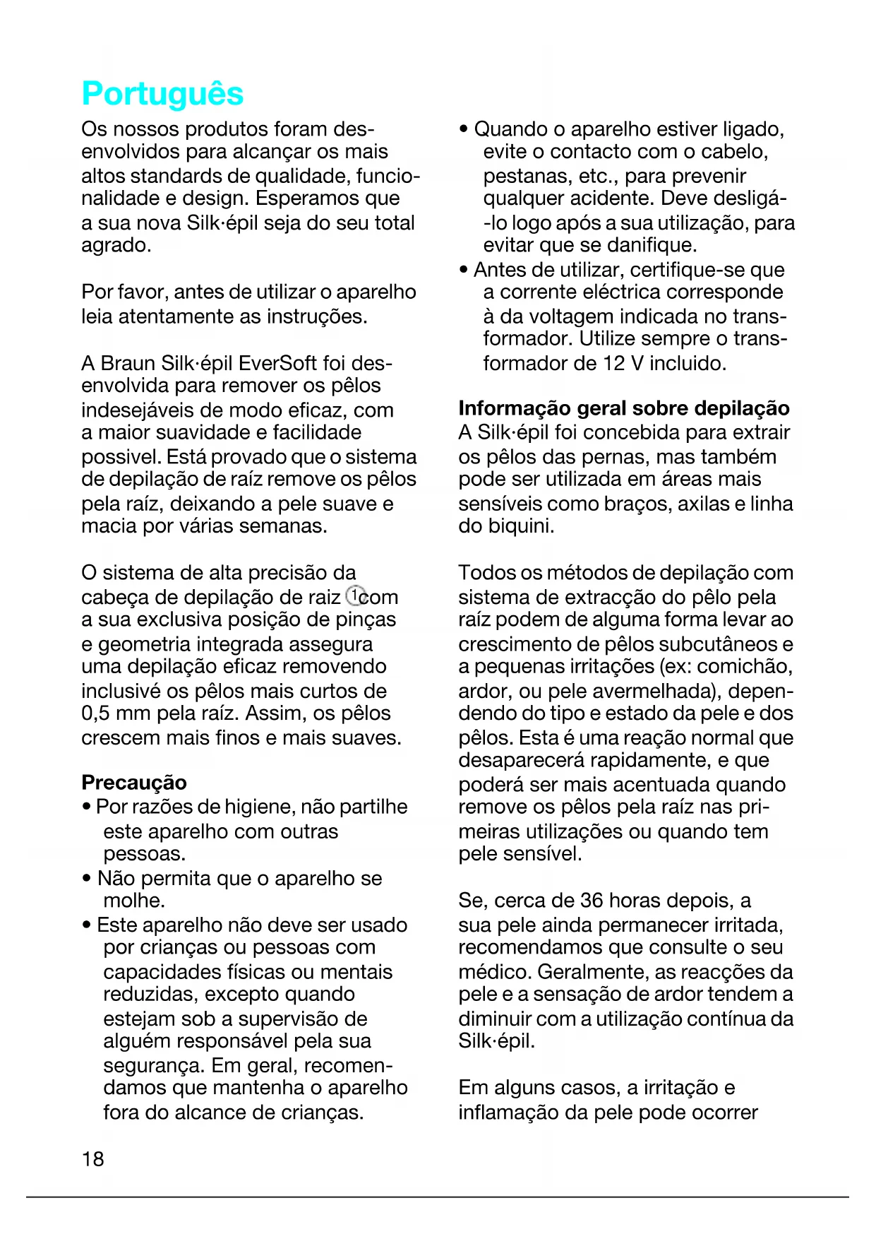 5366377_SE2180_P6-52 Seite 17 Donnerstag, 13. Dezember 2007 3:39 1518 Português Os nossos produtos foram des- envolvidos para alcançar os mais altos standards de qualidade, funcio- nalidade e design. Esperamos que a sua nova Silk·épil seja do seu total agrado. Por favor, antes de utilizar o aparelho leia atentamente as instruções. A Braun Silk·épil EverSoft foi des- envolvida para remover os pêlos indesejáveis de modo eficaz, com a maior suavidade e facilidade possivel. Está provado que o sistema de depilação de raíz remove os pêlos pela raíz, deixando a pele suave e macia por várias semanas. O sistema de alta precisão da cabeça de depilação de raiz com a sua exclusiva posição de pinças e geometria integrada assegura uma depilação eficaz removendo inclusivé os pêlos mais curtos de 0,5 mm pela raíz. Assim, os pêlos crescem mais finos e mais suaves. Precaução