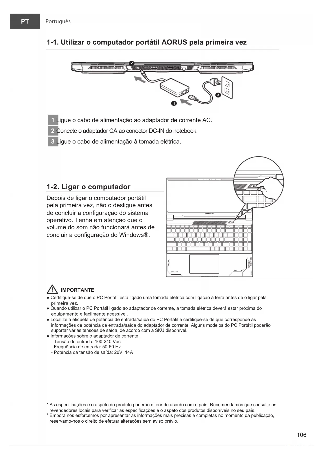 1 Ligue o cabo de alimentação ao adaptador de corrente AC. 2 Conecte o adaptador CA ao conector DC-IN do notebook. 3 Ligue o cabo de alimentação à tomada elétrica. 1-2. Ligar o computador Depois de ligar o computador portátil pela primeira vez, não o desligue antes de concluir a conguração do sistema operativo. Tenha em atenção que o volume do som não funcionará antes de concluir a conguração do Windows®. IMPORTANTE● Certifique-se de que o PC Portátil está ligado uma tomada elétrica com ligação à terra antes de o ligar pela primeira vez.● Quando utilizar o PC Portátil ligado ao adaptador de corrente, a tomada elétrica deverá estar próxima do equipamento e facilmente acessível.● Localize a etiqueta de potência de entrada/saída do PC Portátil e certifique-se de que corresponde às informações de potência de entrada/saída do adaptador de corrente. Alguns modelos do PC Portátil poderão suportar várias tensões de saída, de acordo com a SKU disponível.● Informações sobre o adaptador de corrente: - Tensão de entrada: 100-240 Vac - Frequência de entrada: 50-60 Hz - Potência da tensão de saída: 20V, 14A* As especicações e o aspeto do produto poderão diferir de acordo com o país. Recomendamos que consulte os revendedores locais para vericar as especicações e o aspeto dos produtos disponíveis no seu país. * Embora nos esforcemos por apresentar as informações mais precisas e completas no momento da publicação, reservamo-nos o direito de efetuar alterações sem aviso prévio.Português