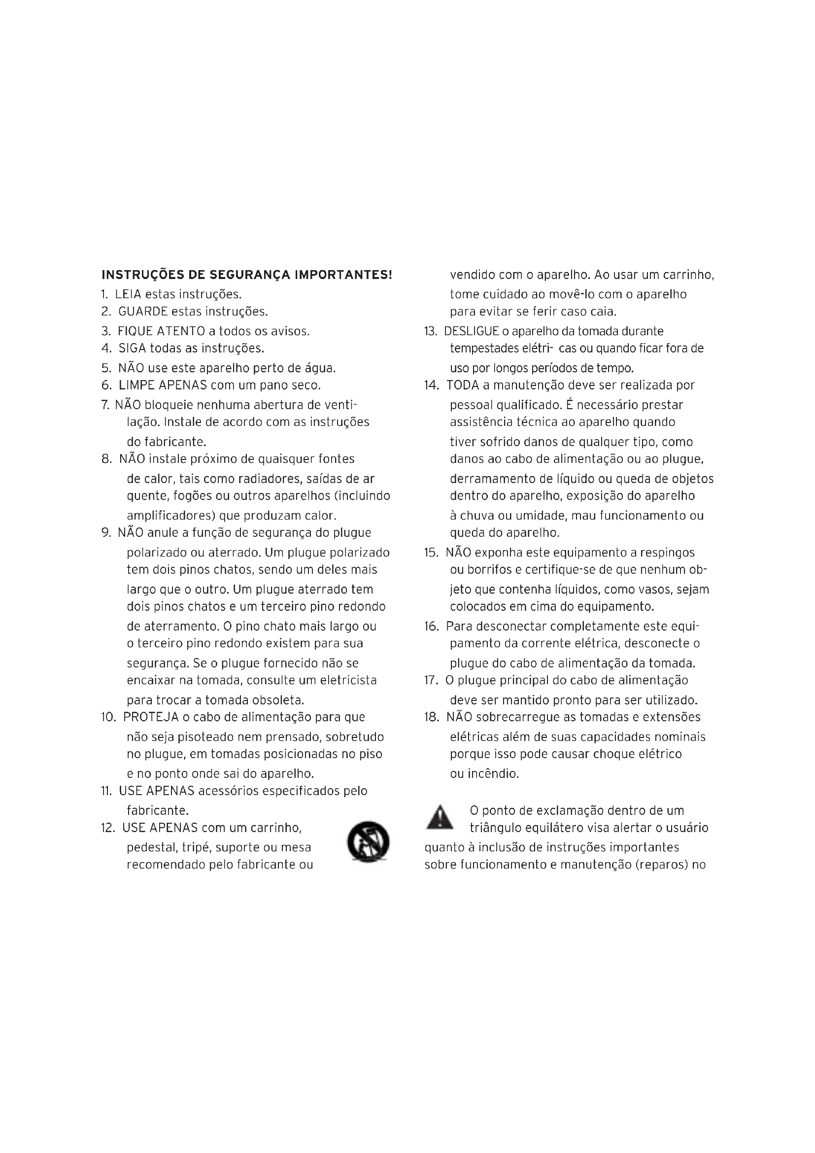 pessoal qualificado. É necessário prestar assistência técnica ao aparelho quando tiver sofrido danos de qualquer tipo, como danos ao cabo de alimentação ou ao plugue, derramamento de líquido ou queda de objetos dentro do aparelho, exposição do aparelho à chuva ou umidade, mau funcionamento ou queda do aparelho.