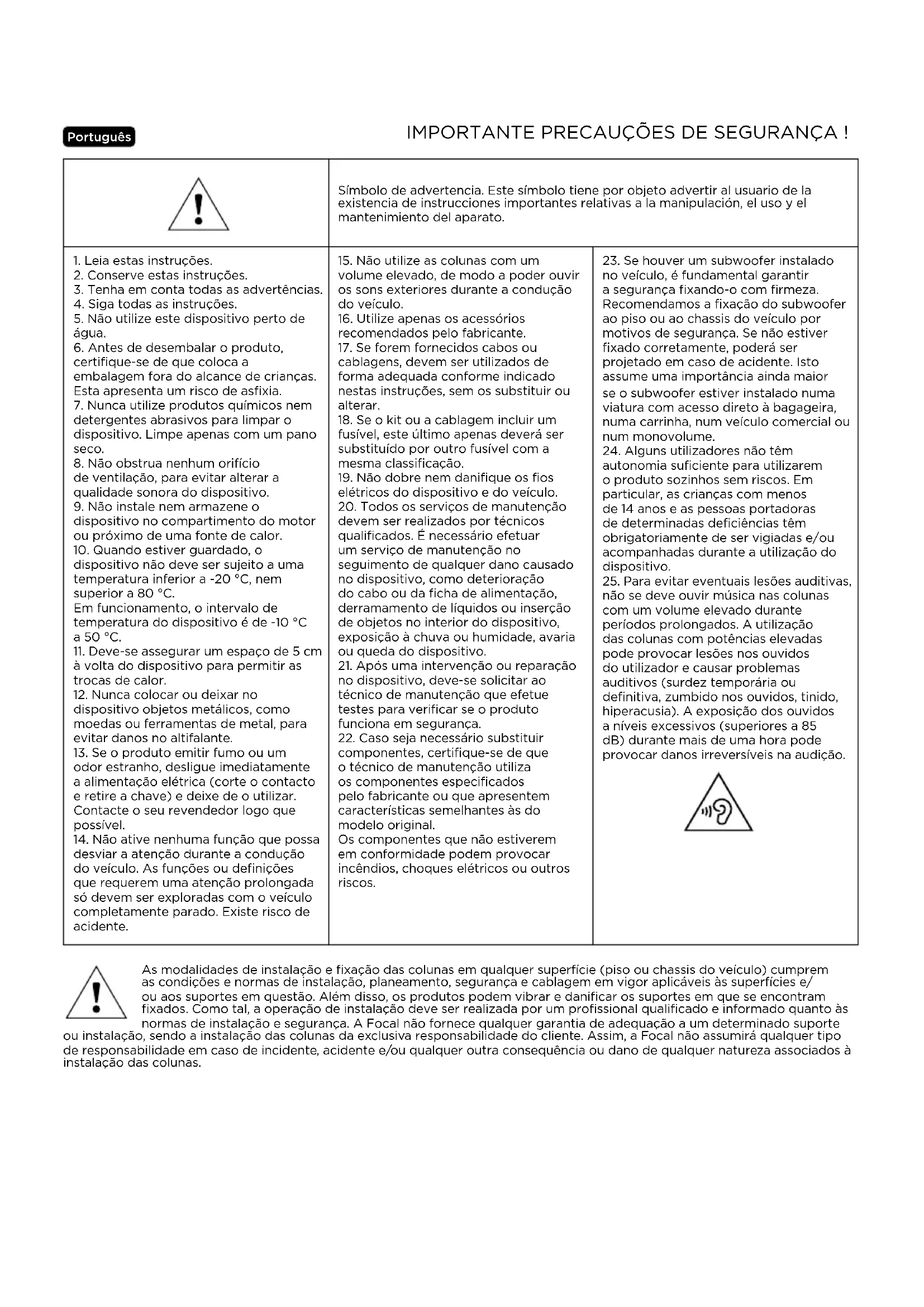 - Monte os altifalantes Focal nos locais de origem da sua viatura e, em seguida, ligue-os. Os detalhes da instalação podem variar consoante os modelos (ver tab.); recomendamos que veja os nossos tutoriais de montagem online. Para melhorar o desempenho da sua instalação e eliminar os ruídos e interferências, recomendamos a utilização do amortecimento acústico "B.A.M. " comercializado pela Focal. CUIDADOS ESPECIAIS Revestimento das portas Uma vez desmontado, o revestimento da porta não pode ser colocado no solo. Deve ser posicionado num suporte elevado para evitar danos no mesmo ou nos cabos. Para validar a garantia Focal-JMlab, agora é possível registar o seu produto online: www.focal.com/garantie28