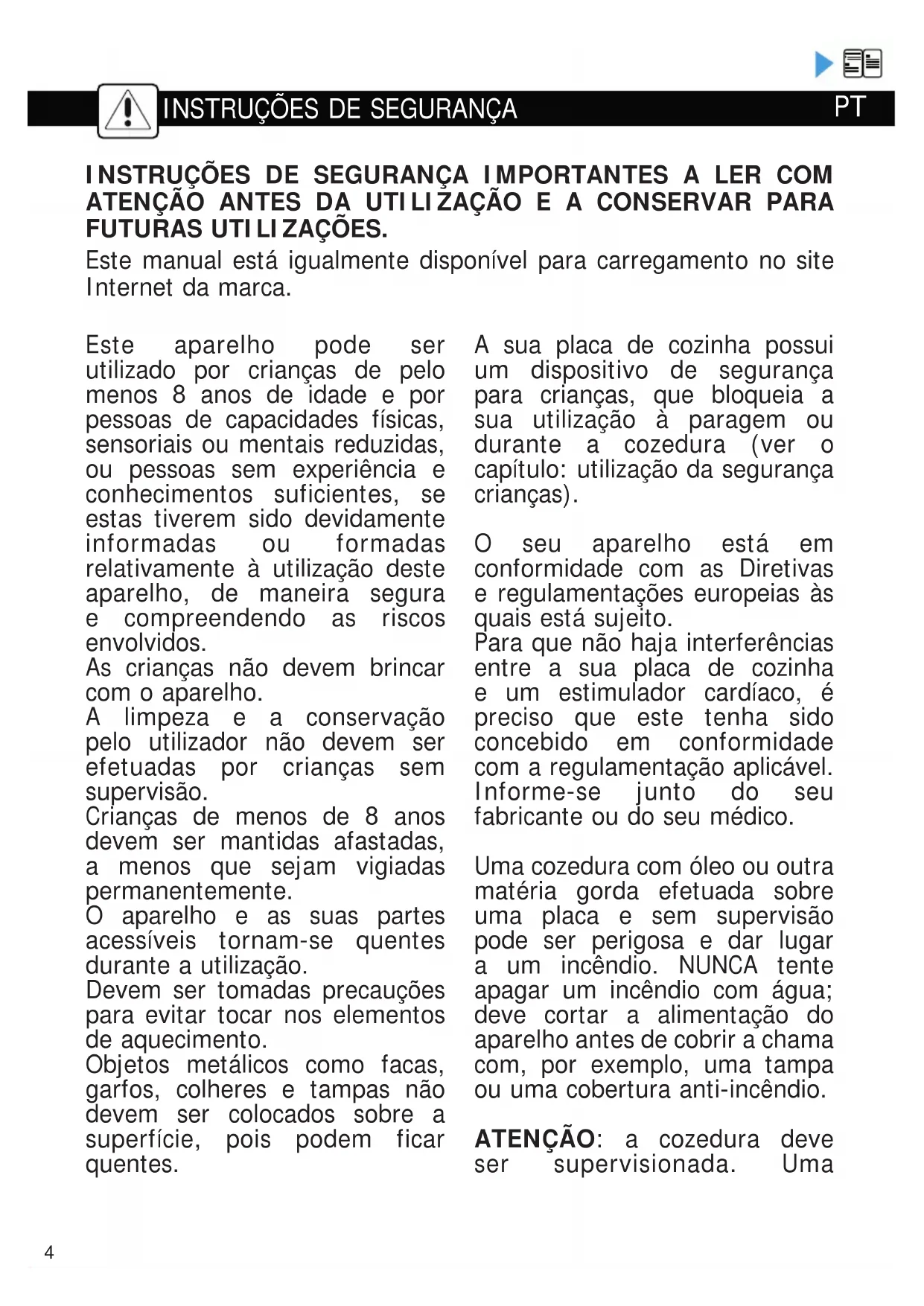 PT4 Este aparelho pode ser utilizado por crianças de pelo menos 8 anos de idade e por pessoas de capacidades físicas, sensoriais ou mentais reduzidas, ou pessoas sem experiência e conhecimentos suficientes, se estas tiverem sido devidamente informadas ou formadas relativamente à utilização deste aparelho, de maneira segura e compreendendo as riscos envolvidos. As crianças não devem brincar com o aparelho. A limpeza e a conservação pelo utilizador não devem ser efetuadas por crianças sem supervisão. Crianças de menos de 8 anos devem ser mantidas afastadas, a menos que sejam vigiadas permanentemente. O aparelho e as suas partes acessíveis tornam-se quentes durante a utilização. Devem ser tomadas precauções para evitar tocar nos elementos de aquecimento. Objetos metálicos como facas, garfos, colheres e tampas não devem ser colocados sobre a superfície, pois podem ficar quentes. A sua placa de cozinha possui um dispositivo de segurança para crianças, que bloqueia a sua utilização à paragem ou durante a cozedura (ver o capítulo: utilização da segurança crianças). O seu aparelho está em conformidade com as Diretivas e regulamentações europeias às quais está sujeito. Para que não haja interferências entre a sua placa de cozinha e um estimulador cardíaco, é preciso que este tenha sido concebido em conformidade com a regulamentação aplicável. Informe-se junto do seu fabricante ou do seu médico. Uma cozedura com óleo ou outra matéria gorda efetuada sobre uma placa e sem supervisão pode ser perigosa e dar lugar a um incêndio. NUNCA tente apagar um incêndio com água; deve cortar a alimentação do aparelho antes de cobrir a chama com, por exemplo, uma tampa ou uma cobertura anti-incêndio. ATENÇÃO: a cozedura deve ser supervisionada. Uma INSTRUÇÕES DE SEGURANÇA IMPORTANTES A LER COM ATENÇÃO ANTES DA UTILIZAÇÃO E A CONSERVAR PARA FUTURAS UTILIZAÇÕES. Este manual está igualmente disponível para carregamento no site Internet da marca.