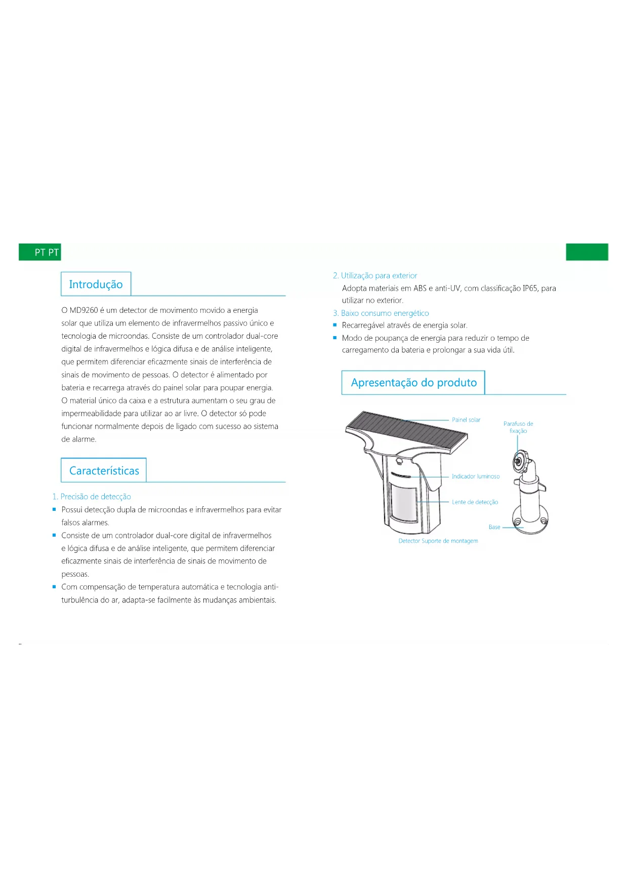 instale-o num local com adequada exposição à luz solar. Chão Ligar à central Certique-se de que a central está no modo de emparelhamento, accione o detector para alarme até a central emitir um toque, o que indica uma ligação bem-sucedida. Arme o sistema, accione novamente o detector e a sirene da central tocará para conrmar que a ligação foi estabelecida. Especicações Fonte de alimentação: Bateria de lítio recarregável 18650 de 3,7 V e 1800 mAh Corrente em espera: < 0,16 mA Corrente de saída do painel solar: Luminância 2000 lx ≥ 4 mA Tempo de espera da bateria: < 150 dias Alcance de detecção: 8 m/110° Distância de transmissão sem os: < 80 m (em áreas abertas) Radiofrequência: 433 MHz ERP (dBm) .: -2.94 Condições de funcionamento: Temperatura: -20°C a 50°C Humidade relativa: < 90% (sem condensação) Material da caixa: PC + ABS + ANTI-UV Dimensões do detector (C x L x A): 186 x 200 x 125 mm Dimensões do suporte (C x L x A): 58 x 58 x 120 mmIT IT Introduzione Il rilevatore di movimento solare MD9260 si avvale di un singolo elemento passivo a microonde e infrarossi. È costituito da un chip dual-core digitale di controllo dei raggi infrarossi in logica fuzzy con tecnologia di analisi intelligente per distinguere in modo efcace i segnali di interferenza da quelli di movimento del corpo e ridurre così i falsi allarmi. Il rilevatore è alimentato a batteria e si ricarica attraverso il pannello solare, per risparmiare energia. L'avanzato materiale dell'alloggiamento e la struttura migliorano l'impermeabilità, per l'utilizzo all'aperto. Il rilevatore può funzionare normalmente solo dopo essere stato connesso correttamente al sistema di allarme. Caratteristiche