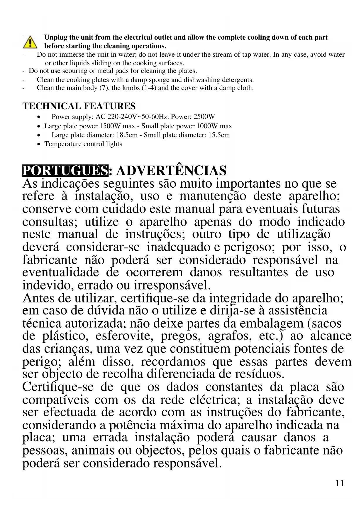 As indicações seguintes são muito importantes no que se refere à instalação, uso e manutenção deste aparelho; conserve com cuidado este manual para eventuais futuras consultas; utilize o aparelho apenas do modo indicado neste manual de instruções; outro tipo de utilização deverá considerar-se inadequado e perigoso; por isso, o fabricante não poderá ser considerado responsável na eventualidade de ocorrerem danos resultantes de uso indevido, errado ou irresponsável. Antes de utilizar, certifique-se da integridade do aparelho; em caso de dúvida não o utilize e dirija-se à assistência técnica autorizada; não deixe partes da embalagem (sacos de plástico, esferovite, pregos, agrafos, etc.) ao alcance das crianças, uma vez que constituem potenciais fontes de perigo; além disso, recordamos que essas partes devem ser objecto de recolha diferenciada de resíduos. Certifique-se de que os dados constantes da placa são compatíveis com os da rede eléctrica; a instalação deve ser efectuada de acordo com as instruções do fabricante, considerando a potência máxima do aparelho indicada na placa; uma errada instalação poderá causar danos a pessoas, animais ou objectos, pelos quais o fabricante não poderá ser considerado responsável.12 Caso seja necessário o uso de adaptadores, tomadas múltiplas e extensões, utilizar só as que estiverem conformes às normas de segurança em vigor; em qualquer caso, nunca ultrapassar os limites de absorção indicados no adaptador e/ou nas extensões, nem os de máxima potência indicados nos adaptadores múltiplos. Não deixar o aparelho inutilmente ligado à corrente; é preferível retirar a ficha da tomada eléctrica quando o aparelho não estiver a ser utilizado. Sempre desconecte o aparelho da fonte de alimentação se for deixado sem supervisão e antes de montá-lo e desmontá-lo. As operações de limpeza devem ser efectuadas depois de se ter desligado a ficha da tomada eléctrica. Sempre que o aparelho estiver fora de uso e seja decidido não o reparar, recomenda-se a sua inutilização, cortando- lhe o cabo de alimentação; - Não aproximar o cabo de alimentação de objectos cortantes ou de superfícies quentes, e não o puxar para arrancar a ficha da tomada eléctrica. Não deixe que ele fique pendurado na bancada onde a criança pode segurá- lo. Não utilizar o aparelho no caso de o cabo de alimentação ou a ficha se encontrarem danificados, ou em caso de curto-circuitos; Nessa eventualidade, leve o aparelho a um centro de assistência autorizado. - Não expor o aparelho a condições atmosféricas adversas, como chuva, humidade, gelo, etc. Conserve-o em lugares secos. - Não manusear ou tocar o aparelho com as mãos molhadas ou os pés descalços. - Este aparelho não pode ser usado por crianças, mesmo com mais de 8 anos. - Este aparelho pode ser por pessoas com reduzida capacidade física, sensorial ou mental, ou ainda com falta de experiência na sua utilização, desde que lhes13 seja assegurada uma adequada supervisão ou se tiverem sido instruídas no uso do aparelho em segurança. - As crianças não devem brincar com o aparelho. Em caso de avaria e/ou de mau funcionamento, não intervenha sobre o aparelho. Para uma eventual reparação dirija-se unicamente a um centro autorizado pelo fabricante e solicite peças de substituição originais. A não observância destas indicações pode comprometer a segurança do aparelho e inválidar o termos da garantia. - Mantenha o aparelho e o cabo de alimentação fora do alcance de crianças com menos de 8 anos de idade. - Não indicado para uso comercial. Só para uso doméstico. ATENÇÃO: este aparelho inclui uma função de aquecimento. Algumas superfícies, mesmo que não a placa propriamente dita, poderão atingir temperaturas elevadas. Uma vez que a sensibilidade à temperatura difere de pessoa para pessoa, este aparelho deverá ser usado com CUIDADO. Coloque o aparelho exclusivamente sobre superfícies com aderência e preparadas para o efeito, e use as necessárias medidas de protecção contra o calor, como pegas ou luvas. - Este aparelho foi concebido para uso doméstico ou equivalente, em situações como as de refeitórios em pequenas empresas ou outros ambientes de natureza laboral; por clientes de hotéis, motéis ou acomodação turística, como turismo rural ou residencial. - Este aparelho não foi concebido para ser utilizado por intermédio de um temporizador externo ou de um sistema de comando à distância autónomo. - Antes de cada utilização, soltar o cabo de alimentação. - Utilizar somente acessórios e componentes originais. Não sujeite produto a impactos, pois isso pode danificá-lo Manter o aparelho afastado de materiais inflamáveis, fontes de calor, zonas frias e vapor, papel ou cortinados.14
