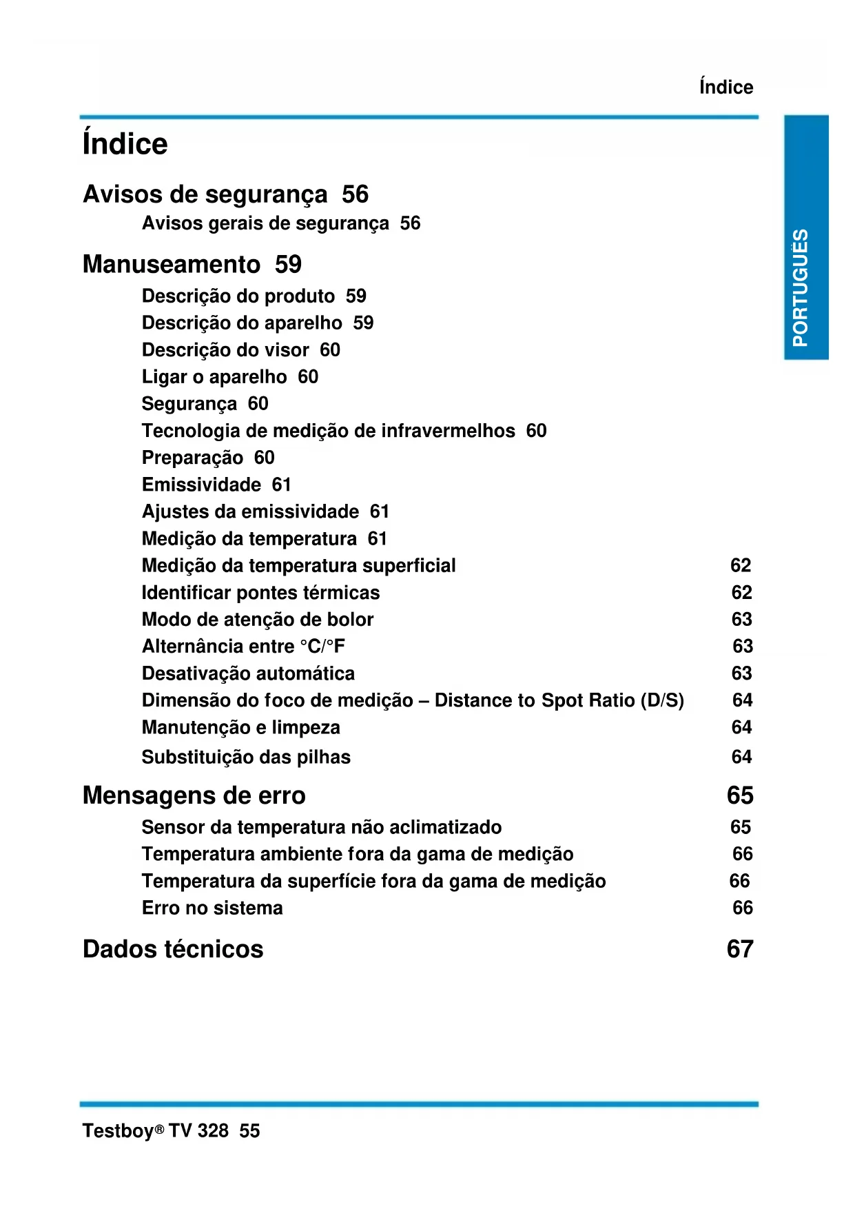 TV 328 55 PORTUGUÊS Índice Avisos de segurança 56 Avisos gerais de segurança 56 Manuseamento 59 Descrição do produto 59 Descrição do aparelho 59 Descrição do visor 60 Ligar o aparelho 60 Segurança 60 Tecnologia de medição de infravermelhos 60 Preparação 60 Emissividade 61 Ajustes da emissividade 61 Medição da temperatura 61 Medição da temperatura superficial 62 Identificar pontes térmicas 62 Modo de atenção de bolor 63 Alternância entre °C/°F 63 Desativação automática 63 Dimensão do foco de medição – Distance to Spot Ratio (D/S) 64 Manutenção e limpeza 64 Substituição das pilhas 64 Mensagens de erro 65 Sensor da temperatura não aclimatizado 65 Temperatura ambiente fora da gama de medição 66 Temperatura da superfície fora da gama de medição 66 Erro no sistema 66 Dados técnicos 67Avisos de segurança 56 Testboy