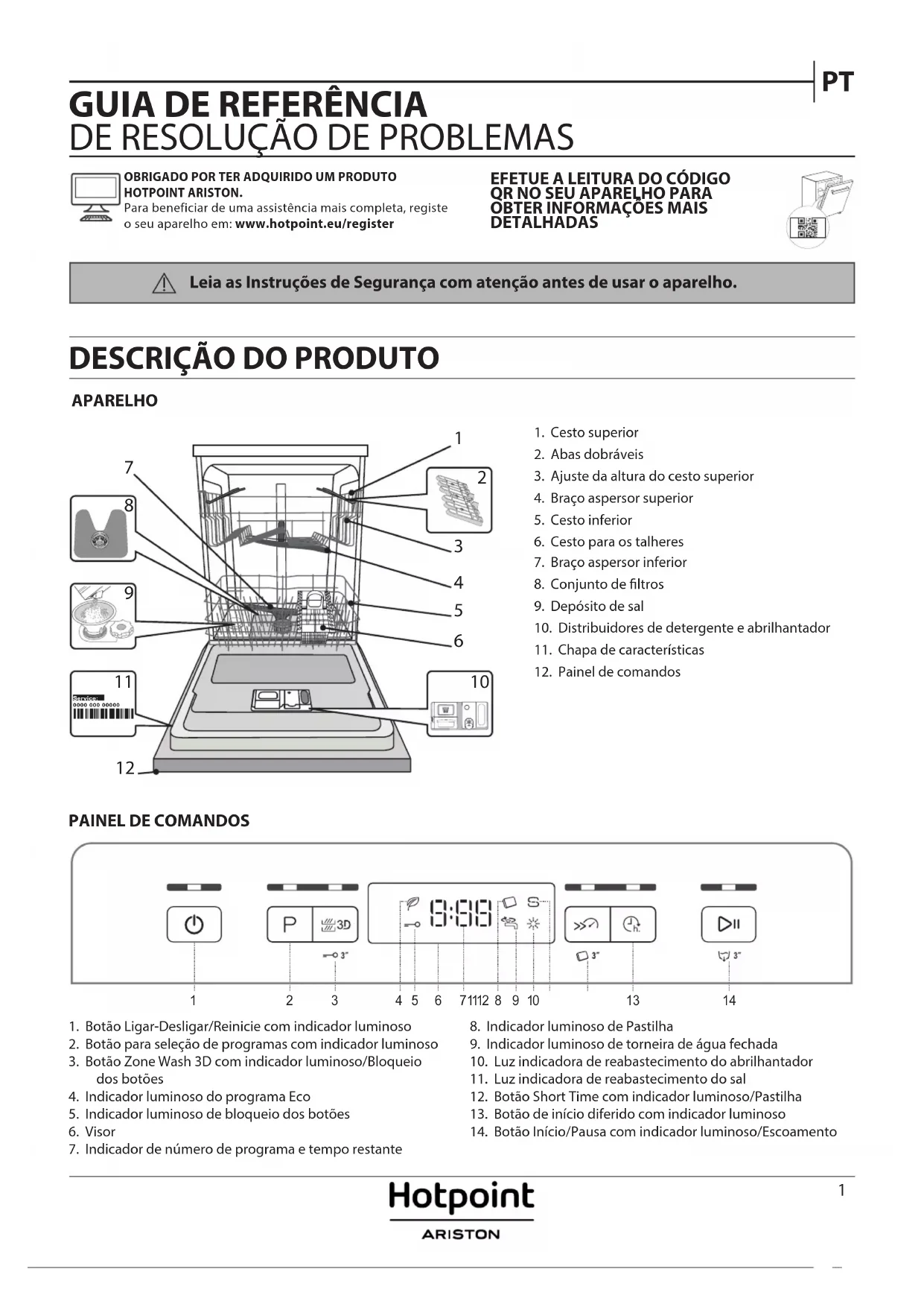 OBRIGADO POR TER ADQUIRIDO UM PRODUTO HOTPOINT ARISTON Para beneficiar de uma assistência mais completa, registe o seu aparelho em: www.hotpoint.eu/register1. Cesto superior2. Abas dobráveis3. Ajuste da altura do cesto superior4. Braço aspersor superior5. Cesto inferior6. Cesto para os talheres7. Braço aspersor inferior8. Conjunto de ltros9. Depósito de sal10. Distribuidores de detergente e abrilhantador11. Chapa de características12. Painel de comandos0000 000 00000 Service: