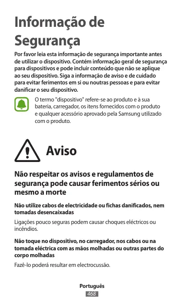 Informação de Segurança Por favor leia esta informação de segurança importante antes de utilizar o dispositivo. Contém informação geral de segurança para dispositivos e pode incluir conteúdo que não se aplique ao seu dispositivo. Siga a informação de aviso e de cuidado para evitar ferimentos em si ou noutras pessoas e para evitar danificar o seu dispositivo. O termo "dispositivo" refere-se ao produto e à sua bateria, carregador, os itens fornecidos com o produto e qualquer acessório aprovado pela Samsung utilizado com o produto.