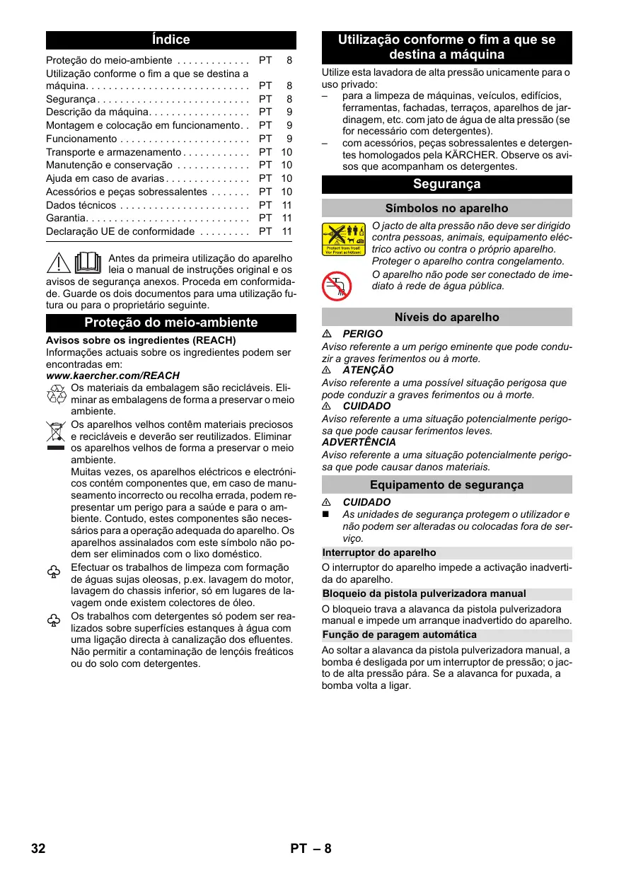Utilização conforme o fim a que se destina a máquina Utilize esta lavadora de alta pressão unicamente para o uso privado: – para a limpeza de máquinas, veículos, edifícios, ferramentas, fachadas, terraços, aparelhos de jardinagem, etc. com jato de água de alta pressão (se for necessário com detergentes). – com acessórios, peças sobressalentes e detergentes homologados pela KÄRCHER. Observe os avisos que acompanham os detergentes. Segurança Símbolos no aparelho O jacto de alta pressão não deve ser dirigido contra pessoas, animais, equipamento eléctrico activo ou contra o próprio aparelho. Proteger o aparelho contra congelamento. O aparelho não pode ser conectado de imediato à rede de água pública. Antes da primeira utilização do aparelho leia o manual de instruções original e os avisos de segurança anexos. Proceda em conformidade. Guarde os dois documentos para uma utilização futura ou para o proprietário seguinte. Proteção do meio-ambiente Avisos sobre os ingredientes (REACH) Informações actuais sobre os ingredientes podem ser encontradas em: www.kaercher.com/REACH Os materiais da embalagem são recicláveis. Eliminar as embalagens de forma a preservar o meio ambiente. Os aparelhos velhos contêm materiais preciosos e recicláveis e deverão ser reutilizados. Eliminar os aparelhos velhos de forma a preservar o meio ambiente. Muitas vezes, os aparelhos eléctricos e electrónicos contém componentes que, em caso de manuseamento incorrecto ou recolha errada, podem representar um perigo para a saúde e para o ambiente. Contudo, estes componentes são necessários para a operação adequada do aparelho. Os aparelhos assinalados com este símbolo não podem ser eliminados com o lixo doméstico. Efectuar os trabalhos de limpeza com formação de águas sujas oleosas, p.ex. lavagem do motor, lavagem do chassis inferior, só em lugares de lavagem onde existem colectores de óleo. Os trabalhos com detergentes só podem ser realizados sobre superfícies estanques à água com uma ligação directa à canalização dos efluentes. Não permitir a contaminação de lençóis freáticos ou do solo com detergentes.