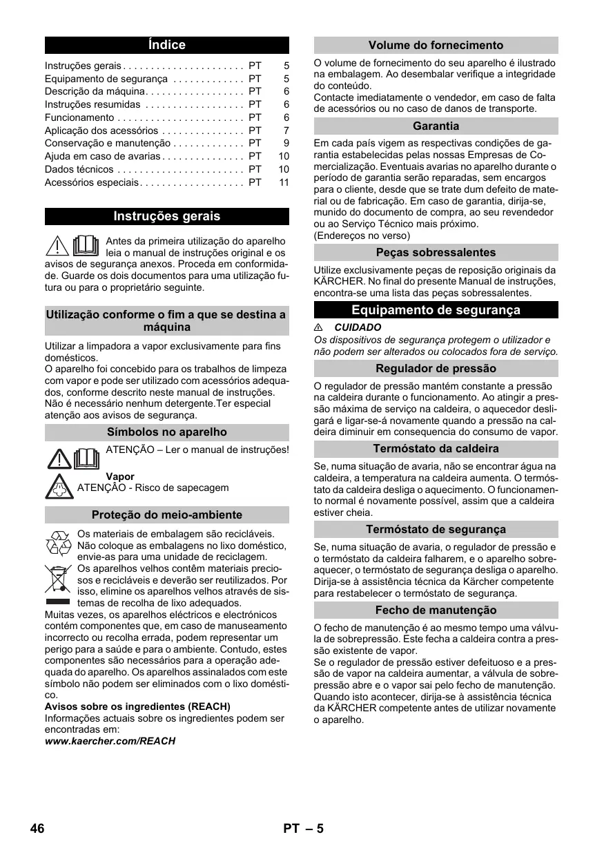 Instruções gerais Antes da primeira utilização do aparelho leia o manual de instruções original e os avisos de segurança anexos. Proceda em conformidade. Guarde os dois documentos para uma utilização futura ou para o proprietário seguinte. Utilização conforme o fim a que se destina a máquina Utilizar a limpadora a vapor exclusivamente para fins domésticos. O aparelho foi concebido para os trabalhos de limpeza com vapor e pode ser utilizado com acessórios adequados, conforme descrito neste manual de instruções. Não é necessário nenhum detergente.Ter especial atenção aos avisos de segurança. Símbolos no aparelho O volume de fornecimento do seu aparelho é ilustrado na embalagem. Ao desembalar verifique a integridade do conteúdo. Contacte imediatamente o vendedor, em caso de falta de acessórios ou no caso de danos de transporte. Garantia Em cada país vigem as respectivas condições de garantia estabelecidas pelas nossas Empresas de Comercialização. Eventuais avarias no aparelho durante o período de garantia serão reparadas, sem encargos para o cliente, desde que se trate dum defeito de material ou de fabricação. Em caso de garantia, dirija-se, munido do documento de compra, ao seu revendedor ou ao Serviço Técnico mais próximo. (Endereços no verso) Peças sobressalentes Utilize exclusivamente peças de reposição originais da KÄRCHER. No final do presente Manual de instruções, encontra-se uma lista das peças sobressalentes. Equipamento de segurança 몇 CUIDADO Os dispositivos de segurança protegem o utilizador e não podem ser alterados ou colocados fora de serviço. Regulador de pressão O regulador de pressão mantém constante a pressão na caldeira durante o funcionamento. Ao atingir a pressão máxima de serviço na caldeira, o aquecedor desligará e ligar-se-á novamente quando a pressão na caldeira diminuir em consequencia do consumo de vapor. Termóstato da caldeira ATENÇÃO – Ler o manual de instruções! Se, numa situação de avaria, não se encontrar água na caldeira, a temperatura na caldeira aumenta. O termóstato da caldeira desliga o aquecimento. O funcionamento normal é novamente possível, assim que a caldeira estiver cheia. Vapor ATENÇÂO - Risco de sapecagem Proteção do meio-ambiente Os materiais de embalagem são recicláveis. Não coloque as embalagens no lixo doméstico, envie-as para uma unidade de reciclagem. Os aparelhos velhos contêm materiais preciosos e recicláveis e deverão ser reutilizados. Por isso, elimine os aparelhos velhos através de sistemas de recolha de lixo adequados. Muitas vezes, os aparelhos eléctricos e electrónicos contém componentes que, em caso de manuseamento incorrecto ou recolha errada, podem representar um perigo para a saúde e para o ambiente. Contudo, estes componentes são necessários para a operação adequada do aparelho. Os aparelhos assinalados com este símbolo não podem ser eliminados com o lixo doméstico. Avisos sobre os ingredientes (REACH) Informações actuais sobre os ingredientes podem ser encontradas em: www.kaercher.com/REACH