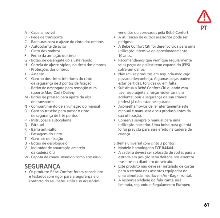 - Capa amovível - Pega de transporte - Ranhuras para o ajuste do cinto dos ombros - Autocolante de aviso - Cinto dos ombros - Fecho da armação do cinto - Botão de desengate do ajuste rápido - Correia de ajuste rápido, do cinto dos ombros - Protecções dos ombros - Assento - Gancho dos cintos inferiores do cinto de segurança de 3 pontos de fixação L - Botão de desengate para remoção num suporte Maxi-Cosi / Quinny M - Botão de pressão para ajuste da alça de transporte N - Compartimento de arrumação do manual O - Gancho traseiro para passar o cinto de segurança de três pontos P - Instruções e autocolante Q - Pára-sol R - Barra anti-salto S - Passagens do cinto T - Ganchos de fixação U - Botão de desbloqueio V - Indicador de amarração amarelo da cadeira Citi W - Capota de chuva. Vendido como acessório SEGURANÇA