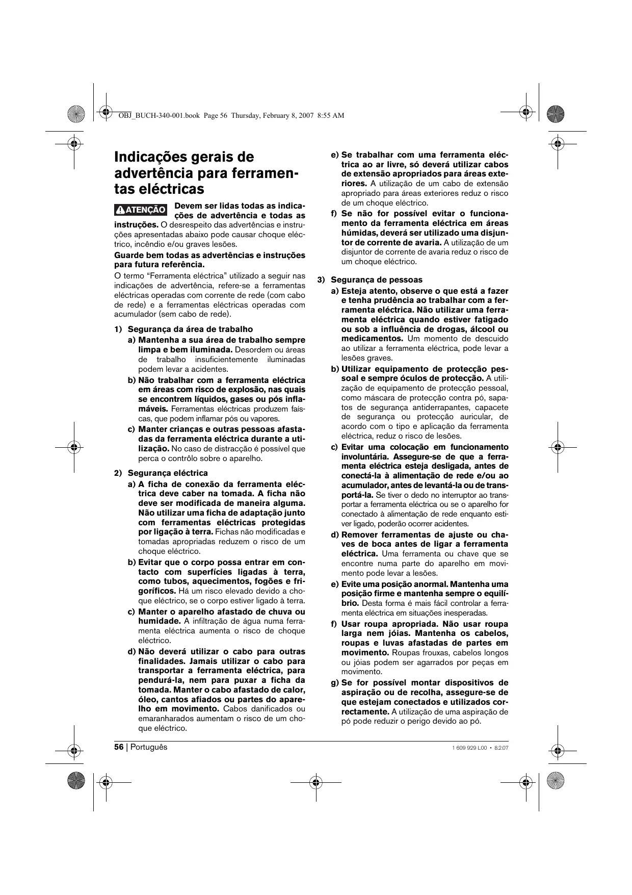 a) Esteja atento, observe o que está a fazer e tenha prudência ao trabalhar com a ferramenta eléctrica. Não utilizar uma ferramenta eléctrica quando estiver fatigado ou sob a influência de drogas, álcool ou medicamentos. Um momento de descuido ao utilizar a ferramenta eléctrica, pode levar a lesões graves. b) Utilizar equipamento de protecção pessoal e sempre óculos de protecção. A utilização de equipamento de protecção pessoal, como máscara de protecção contra pó, sapatos de segurança antiderrapantes, capacete de segurança ou protecção auricular, de acordo com o tipo e aplicação da ferramenta eléctrica, reduz o risco de lesões. c) Evitar uma colocação em funcionamento involuntária. Assegure-se de que a ferramenta eléctrica esteja desligada, antes de conectá-la à alimentação de rede e/ou ao acumulador, antes de levantá-la ou de transportá-la. Se tiver o dedo no interruptor ao transportar a ferramenta eléctrica ou se o aparelho for conectado à alimentação de rede enquanto estiver ligado, poderão ocorrer acidentes. d) Remover ferramentas de ajuste ou chaves de boca antes de ligar a ferramenta eléctrica. Uma ferramenta ou chave que se encontre numa parte do aparelho em movimento pode levar a lesões. e) Evite uma posição anormal. Mantenha uma posição firme e mantenha sempre o equilíbrio. Desta forma é mais fácil controlar a ferramenta eléctrica em situações inesperadas. f) Usar roupa apropriada. Não usar roupa larga nem jóias. Mantenha os cabelos, roupas e luvas afastadas de partes em movimento. Roupas frouxas, cabelos longos ou jóias podem ser agarrados por peças em movimento. g) Se for possível montar dispositivos de aspiração ou de recolha, assegure-se de que estejam conectados e utilizados correctamente. A utilização de uma aspiração de pó pode reduzir o perigo devido ao pó. 1 609 929 L00 • 8.2.07 OBJ_BUCH-340-001.book Page 57 Thursday, February 8, 2007 8:55 AM