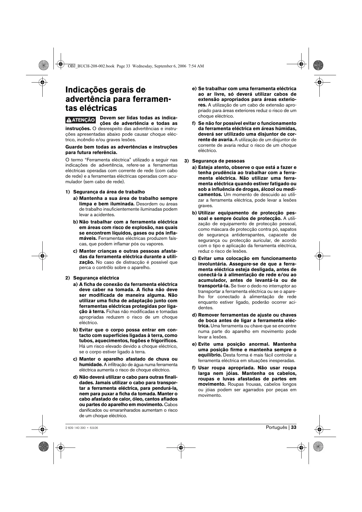 a) Esteja atento, observe o que está a fazer e tenha prudência ao trabalhar com a ferramenta eléctrica. Não utilizar uma ferramenta eléctrica quando estiver fatigado ou sob a influência de drogas, álcool ou medicamentos. Um momento de descuido ao utilizar a ferramenta eléctrica, pode levar a lesões graves. b) Utilizar equipamento de protecção pessoal e sempre óculos de protecção. A utilização de equipamento de protecção pessoal, como máscara de protecção contra pó, sapatos de segurança antiderrapantes, capacete de segurança ou protecção auricular, de acordo com o tipo e aplicação da ferramenta eléctrica, reduz o risco de lesões. c) Evitar uma colocação em funcionamento involuntária. Assegure-se de que a ferramenta eléctrica esteja desligada, antes de conectá-la à alimentação de rede e/ou ao acumulador, antes de levantá-la ou de transportá-la. Se tiver o dedo no interruptor ao transportar a ferramenta eléctrica ou se o aparelho for conectado à alimentação de rede enquanto estiver ligado, poderão ocorrer acidentes. d) Remover ferramentas de ajuste ou chaves de boca antes de ligar a ferramenta eléctrica. Uma ferramenta ou chave que se encontre numa parte do aparelho em movimento pode levar a lesões. e) Evite uma posição anormal. Mantenha uma posição firme e mantenha sempre o equilíbrio. Desta forma é mais fácil controlar a ferramenta eléctrica em situações inesperadas. f) Usar roupa apropriada. Não usar roupa larga nem jóias. Mantenha os cabelos, roupas e luvas afastadas de partes em movimento. Roupas frouxas, cabelos longos ou jóias podem ser agarrados por peças em movimento. Português | 33 OBJ_BUCH-208-002.book Page 34 Wednesday, September 6, 2006 7:54 AM g) Se for possível montar dispositivos de aspiração ou de recolha, assegure-se de que estejam conectados e utilizados correctamente. A utilização de uma aspiração de pó pode reduzir o perigo devido ao pó.