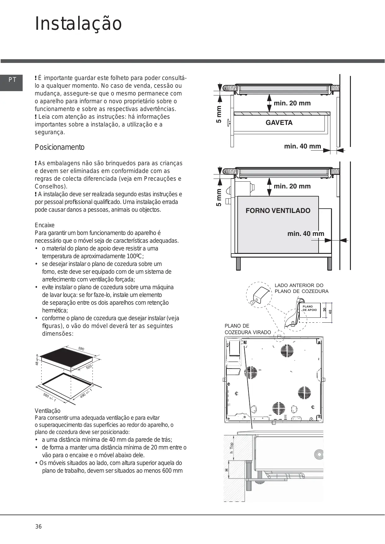 TIROIR • de manière à ce qu’il reste au moins 20 mm de distance entre la découpe d’encastrement et le meuble en dessous. • Les meubles jouxtant la table, dont la hauteur dépasse celle du plan de cuisson, doivent être placés à au moins 600 mm du bord du plan.