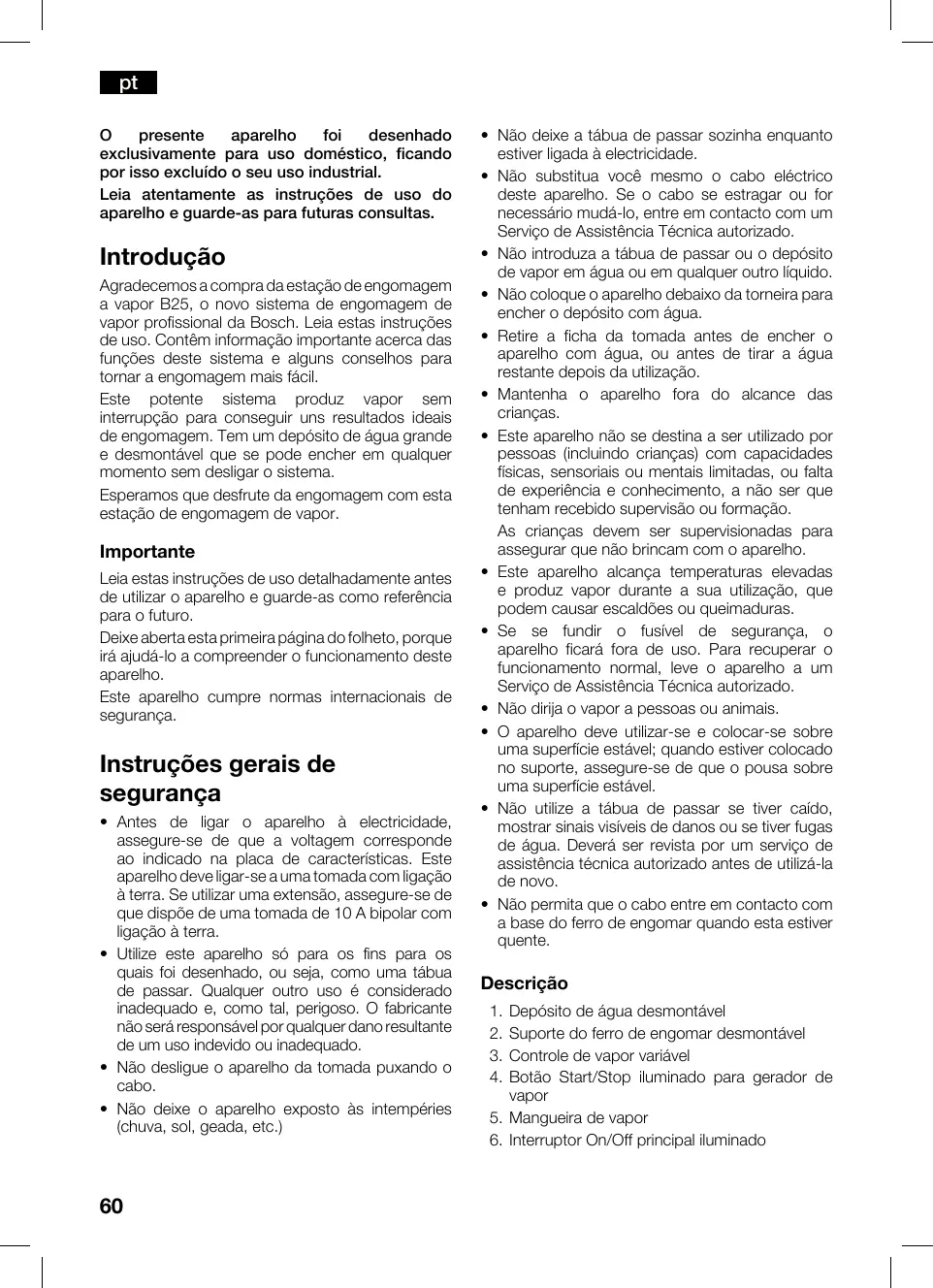 presente aparelho foi desenhado exclusivamente para uso doméstico, ficando por isso excluído o seu uso industrial. Leia atentamente as instruções de uso do aparelho e guarde-as para futuras consultas. Introdução Agradecemos a compra da estação de engomagem a vapor B25, o novo sistema de engomagem de vapor profissional da Bosch. Leia estas instruções de uso. Contêm informação importante acerca das funções deste sistema e alguns conselhos para tornar a engomagem mais fácil. Este potente sistema produz vapor sem interrupção para conseguir uns resultados ideais de engomagem. Tem um depósito de água grande e desmontável que se pode encher em qualquer momento sem desligar o sistema. Esperamos que desfrute da engomagem com esta estação de engomagem de vapor. Importante Leia estas instruções de uso detalhadamente antes de utilizar o aparelho e guarde-as como referência para o futuro. Deixe aberta esta primeira página do folheto, porque irá ajudá-lo a compreender o funcionamento deste aparelho. Este aparelho cumpre normas internacionais de segurança. Instruções gerais de segurança