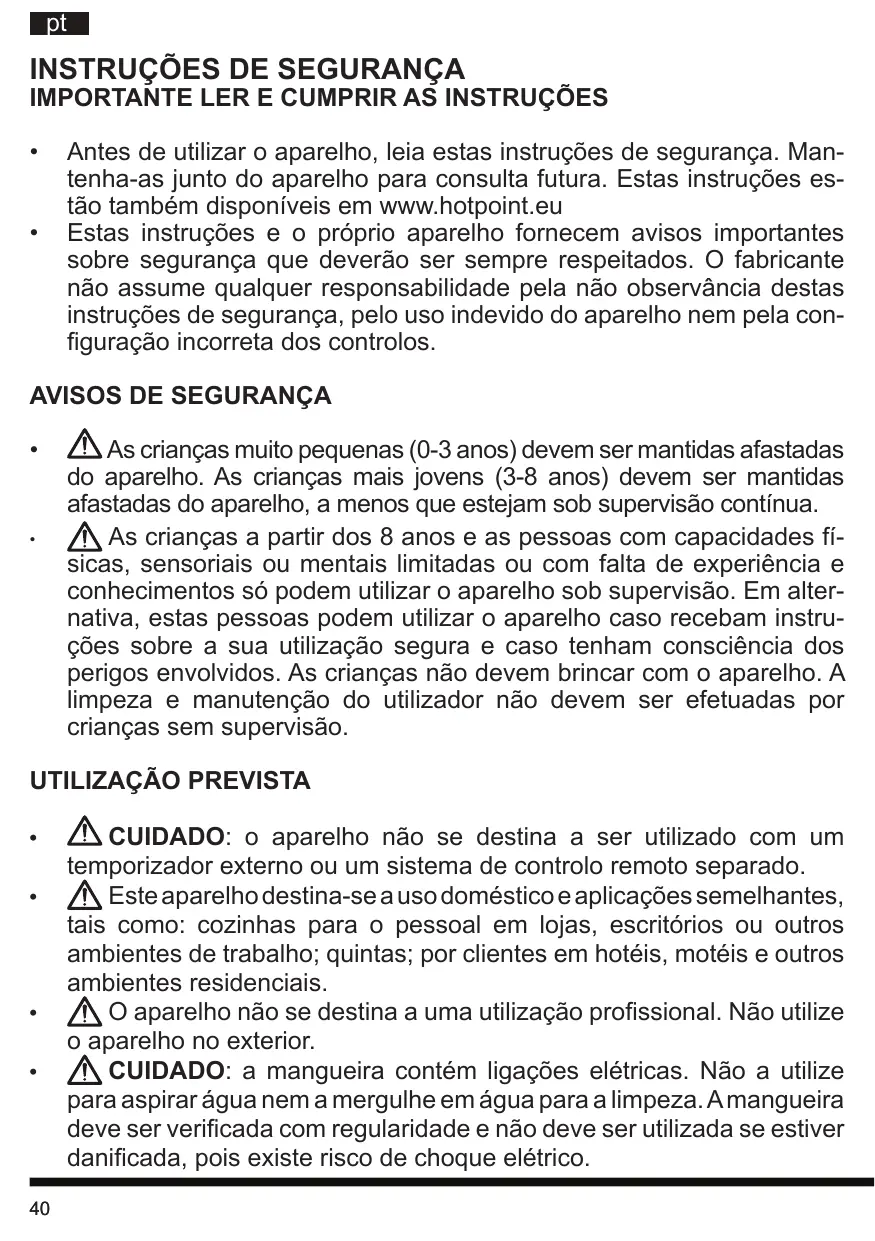 - Antes de utiliser o aparelho, leia estas instruções de segurarça. Mantenha-as+junto do aparelho para consulta futura. Estas instruções estao también disponible em www.hotpoint.eu